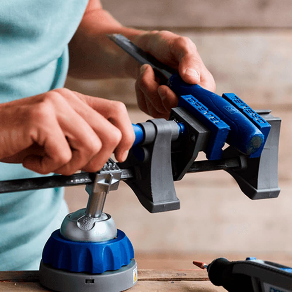 Utilize como porta-ferramentas para criar uma lixa/ esmerilhadeira/ polidora estacionária e fácil de ajustar. Para fixar a sua ferramenta, remova a tampa para ponta da sua micro retífica Dremel, acople o anel porta-ferramentas fornecido, enrosque e aperte a sua ferramenta. Para ajustar o ângulo da Multi-Vise, basta desenroscar a base giratória a qualquer hora e girar 360° com a peça de trabalho ou ferramenta acoplada, para obter o ângulo mais confortável e conveniente para executar o trabalho.