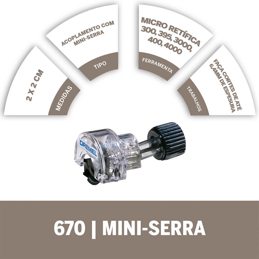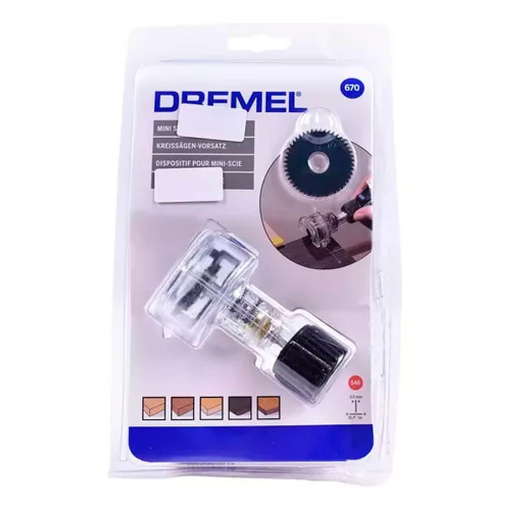 - Conteúdo: 1x acoplamento de minisserra Dremel (670), 1x acessório de lâmina de corte (546), 1x manual/guia de iniciação rápida.