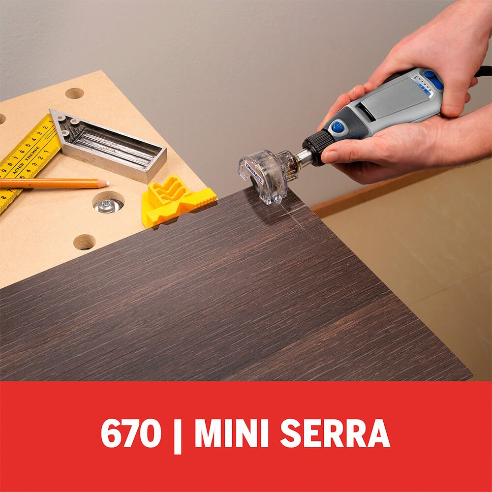 Utilize a micro retífica Dremel como uma minisserra portátil de alta velocidade em um instante. Ganhe a capacidade de realizar cortes retos com um profundidade de 6,35 mm madeira ou materiais afins, como laminado. A base angular do acoplamento de minisserra evita que a barriga da micro retífica Dremel fique no caminho do material que está trabalhando.