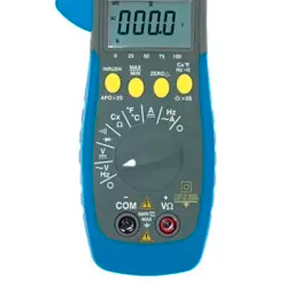 Instrumento digital portátil com capacidade de medida de tensão e corrente em saída de inversores (PWM), função INRUSH e leitura True RMS, de acordo com a categoria III 1000V de segurança, LCD de 4 dígitos com barra gráfica e iluminação, congelamento de leitura e de pico, registro de máximo e mínimo, modo relativo, mudança de faixa automática e desligamento automático. Realiza medidas de tensão DC e AC, corrente DC e AC, resistência, temperatura, freqüência, capacitância e teste continuidade e diodo.