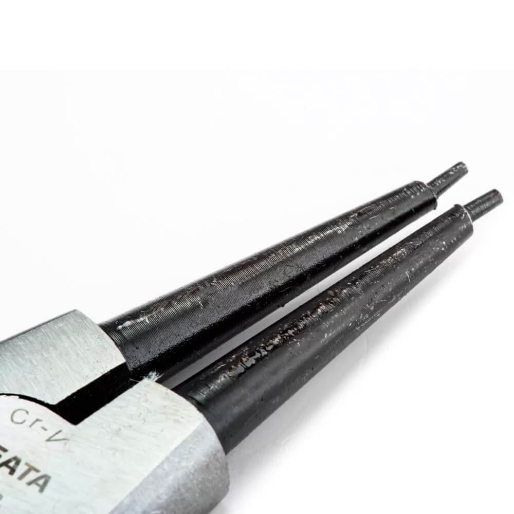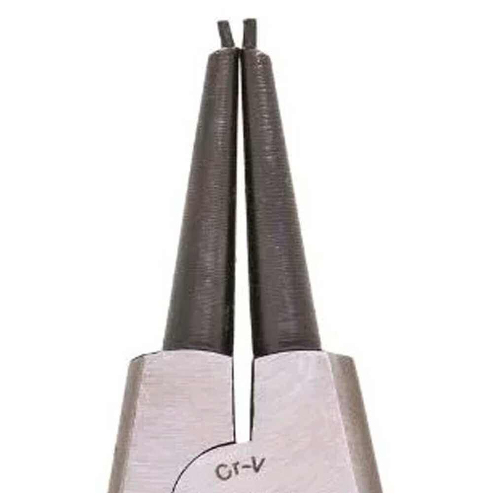 O design do alicate apresenta pontas retas e estreitas, que se encaixam facilmente em espaços apertados e oferecem uma boa visibilidade para o trabalho. As pontas são feitas de aço cromo-vanádio resistente à corrosão e possuem uma superfície dentada para maior aderência aos anéis externos.