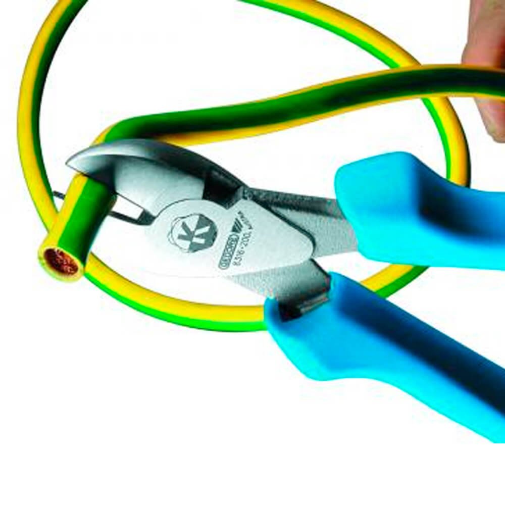 Corpo em aço Gedore-Vanadium e empunhadura em polímero anti-chamas nas cores azul e preto, padrão Gedore. Acabamento niquelado e cromado. Empunhadura ergonômica e antideslizante, com abas protetoras arredondadas para maior conforto e segurança. Produzida por injeção, propiciando isolação até 1000 V, conforme norma NBR 9699, submetida à ensaios de: tensão elétrica, aderência, inflamabilidade e pressão/penetração. Utilizar este Alicate isolado, em tensão máxima de 1000 V em corrente alternada e 1500 V em corrente contínua, conforme norma NBR 9699. Atende com segurança a norma regulamentadora NR 10 - Segurança em Instalações e Serviços em Eletricidade, possui certificado de isolação. Tratamento térmico total e corte temperado por indução com dureza de 63 - 65 HRC, permitindo corte preciso. A geometria do corte está posicionada em diagonal ao corpo do alicate.