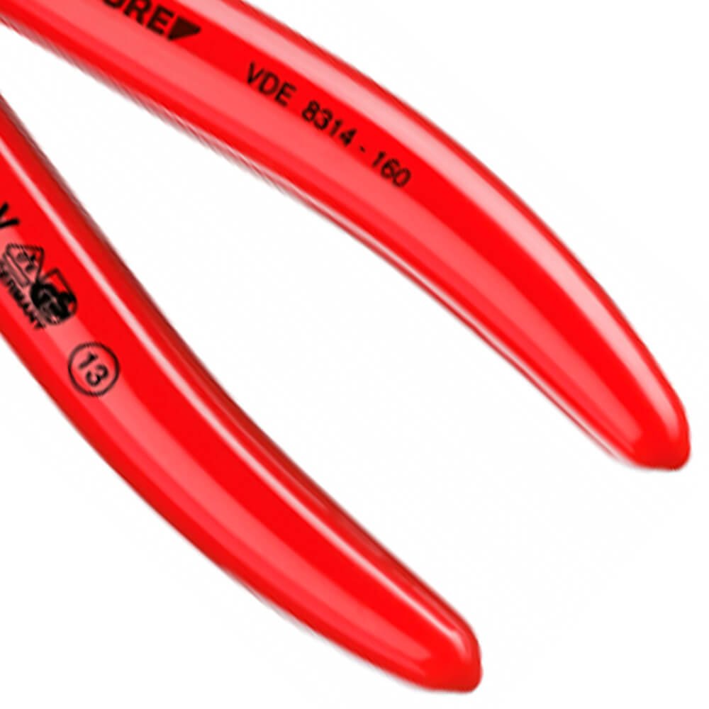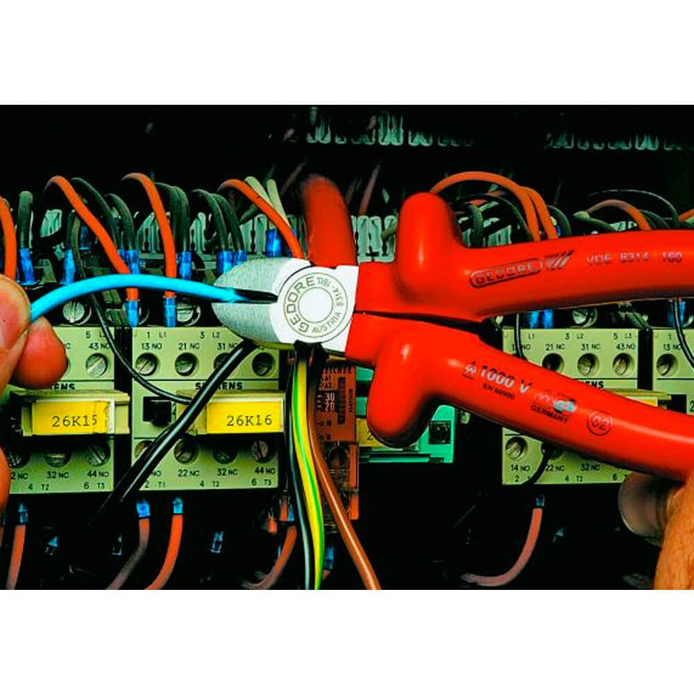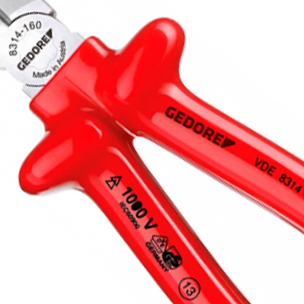 Corpo em aço Gedore-Vanadium e empunhadura em polímero anti-chamas. Acabamento niquelado, cromado e polido. Empunhadura ergonômica, com abas protetoras arredondadas para maior conforto e segurança. Produzida por imersão, propiciando isolação até 1000 V, conforme norma EN 60900 / IEC 60900, submetida à ensaios de: impacto, tensão elétrica, aderência, inflamabilidade e pressão/penetração. Utilizar ferramentas isoladas VDE, em tensão máxima de 1000 V em corrente alternada e 1500 V em corrente contínua, conforme norma EN 60900 / IEC 60900. Possui dupla camada de isolação Check-Tool, no exterior é na cor vermelha, padrão Gedore. Atende com segurança a norma regulamentadora NR 10 - Segurança em Instalações e Serviços em Eletricidade, possui certificado de isolação. Tratamento térmico total e corte temperado por indução, com dureza de 63 - 65 HRC. Com cabeça estreita ideal para espaços reduzidos. A geometria do corte está posicionada em diagonal ao corpo do alicate. Indicado para corte de arame com dureza média, diâmetro máximo de Ø 1,6 mm e com resistência à tração 1600 N/mm². Para trabalhar em montagens e reparos eletroeletrônicos.