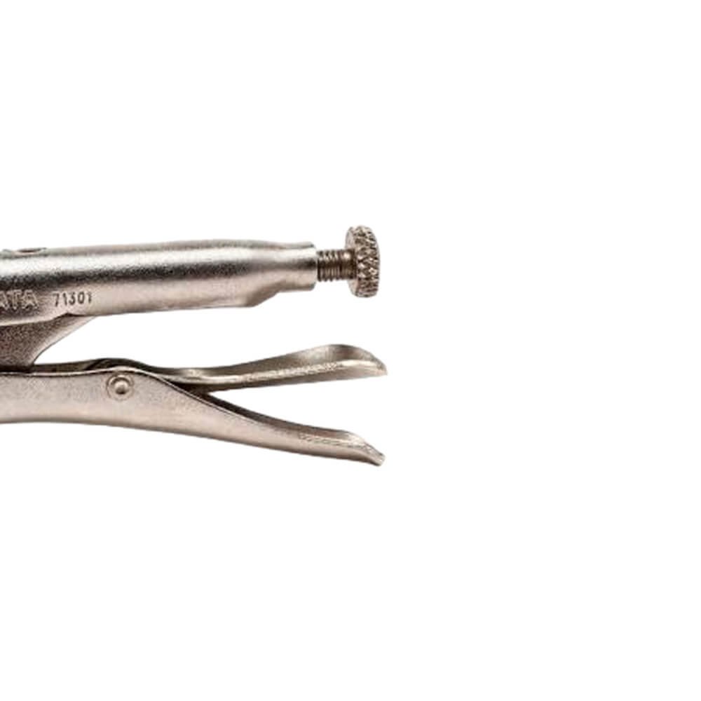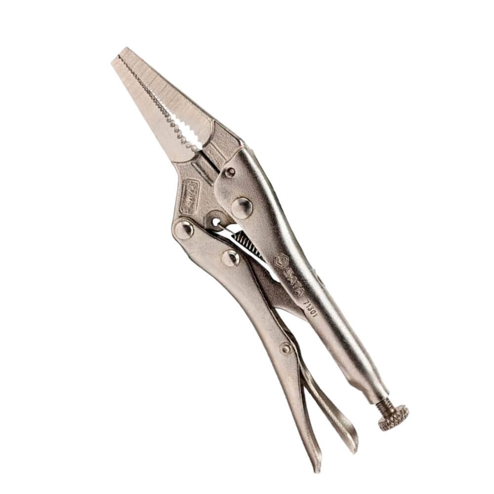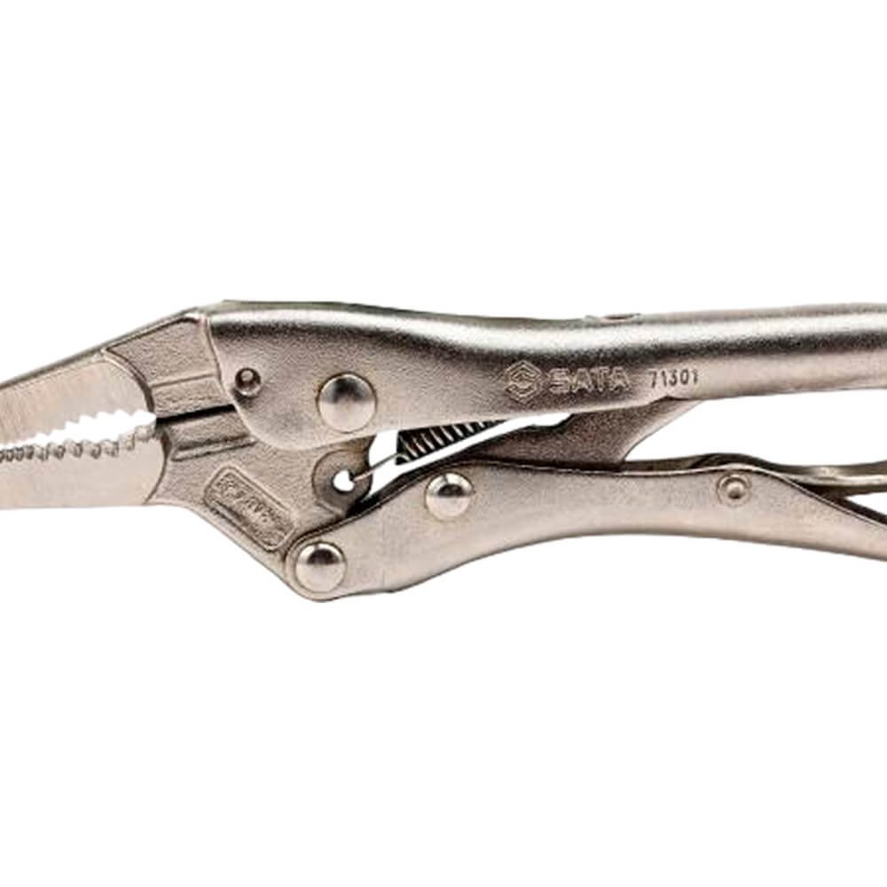 Em Aço Cromo-Molibdênio (Cr-Mo) para resistência extremamente superior.Mandíbula curvada versátil com cortador de fio integrado e dentes angulados para maior aderência de objetos, possui acabamento niquelado resistente à oxidação e corrosão.Alicate Pressão Bico Longo SATA possui um sistema de alavancas que multiplicam ainda mais a força do alicate. O sistema de trava permite manter o objeto travado no aperto, com uma potência de fixação que chega perto de 1 tonelada. Sendo a ferramenta perfeita para segurar ou unir peças planas, cantoneiras e peças de perfil quadrado ou sextavado com segurança.