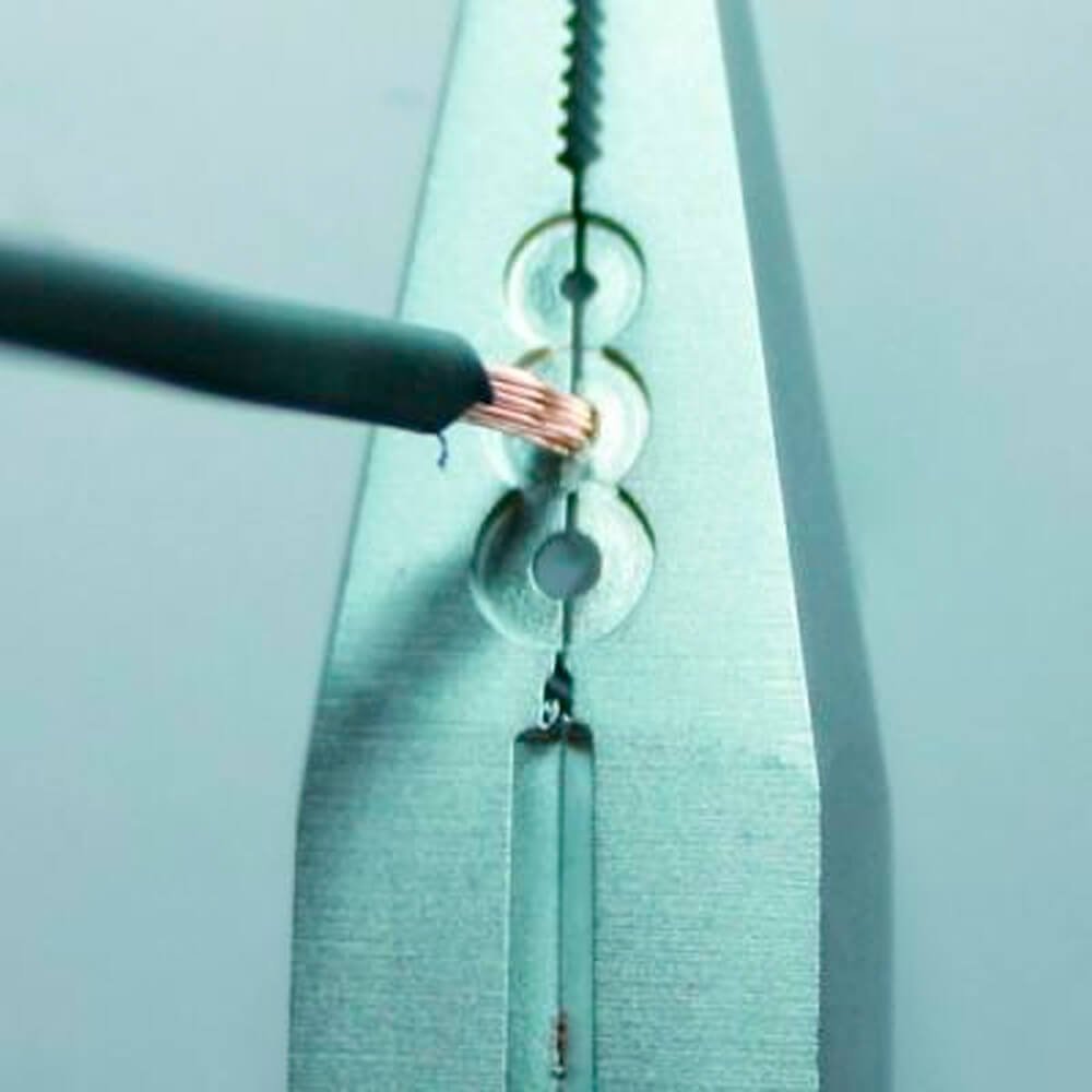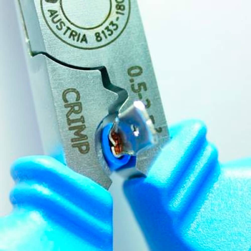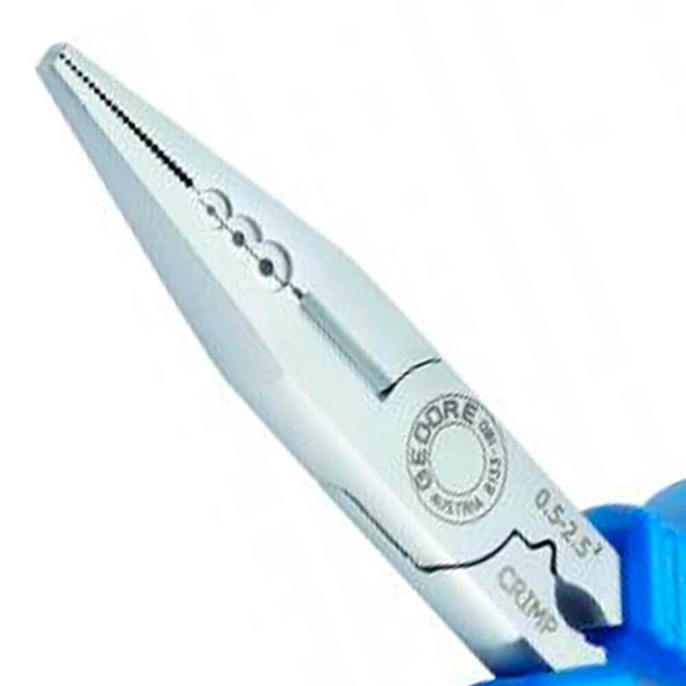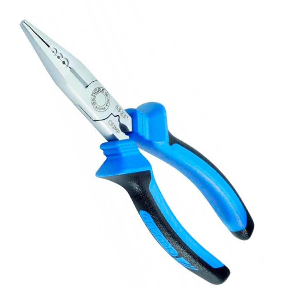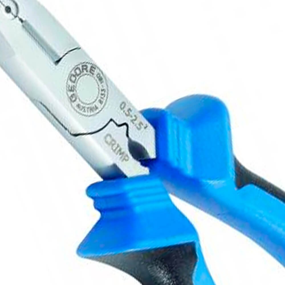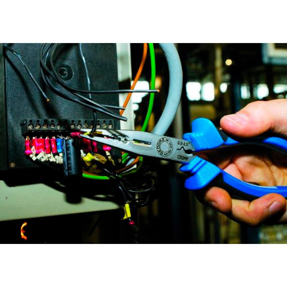 Utilizar este Alicate isolado, em tensão máxima de 1000 V em corrente alternada e 1500 V em corrente contínua, conforme norma NBR 9699. Atende com segurança a norma regulamentadora NR 10 - Segurança em Instalações e Serviços em Eletricidade, possui certificado de isolação. Tratamento térmico total e corte temperado por indução com dureza de 62 - 64 HRC. Alicate com bico semirredono, reto, ponta fina, com dentes finos e em paralelo, que permite puxar, segurrar, cortar, desencapar, amassar e crimpar fios e cabos. Indicado para corte de arame com dureza média, diâmetro máximo de Ø 1,6 mm e com resistência à tração 1600 N/mm². Permite desencapar cabos com seção de 0,5; 1,5 e 2,5 mm² , amassar cabos com seção de 1,0 - 2,5 mm² e crimpar terminais com seção de 0,5 - 2,5 mm². Para utilização em mecânica e eletrônica.