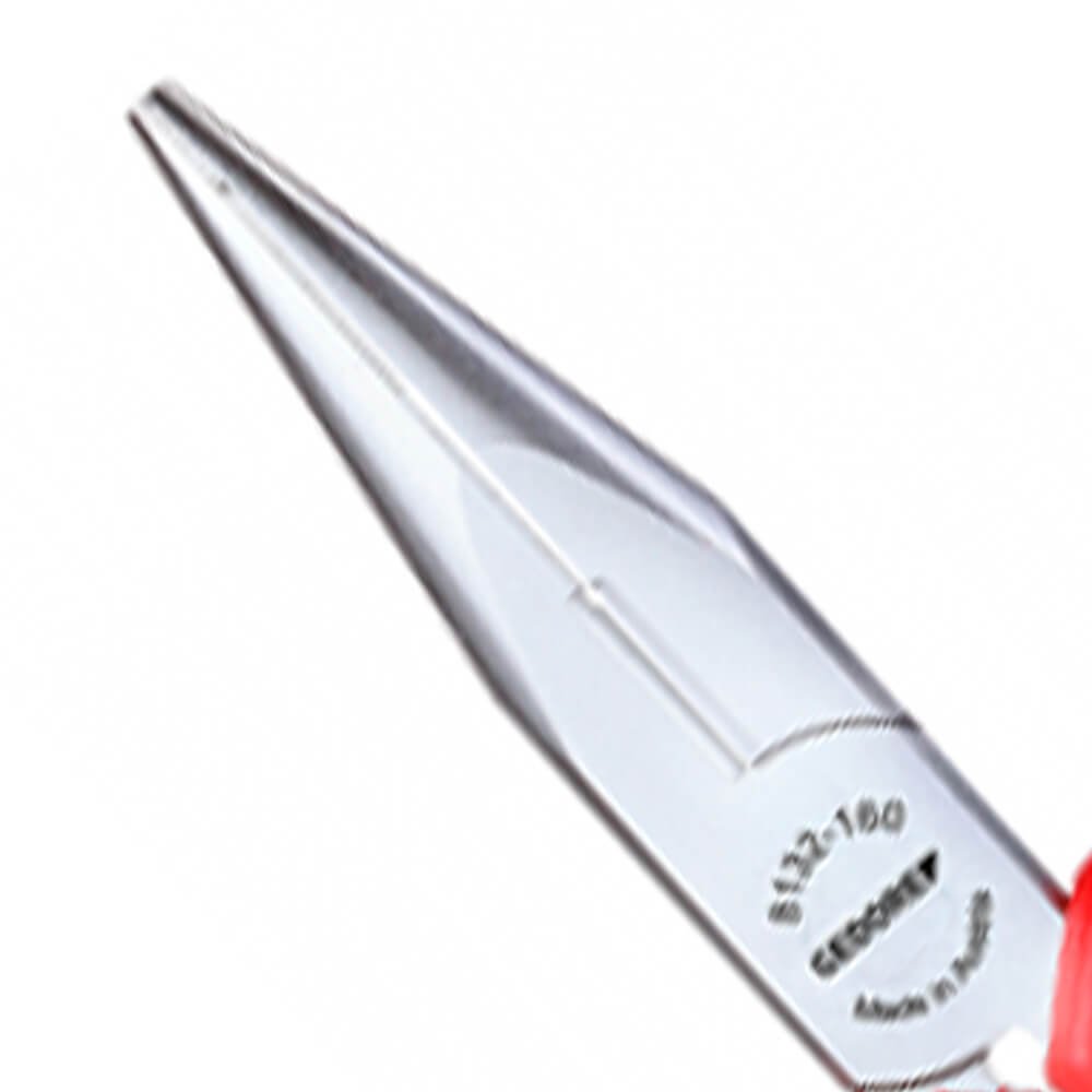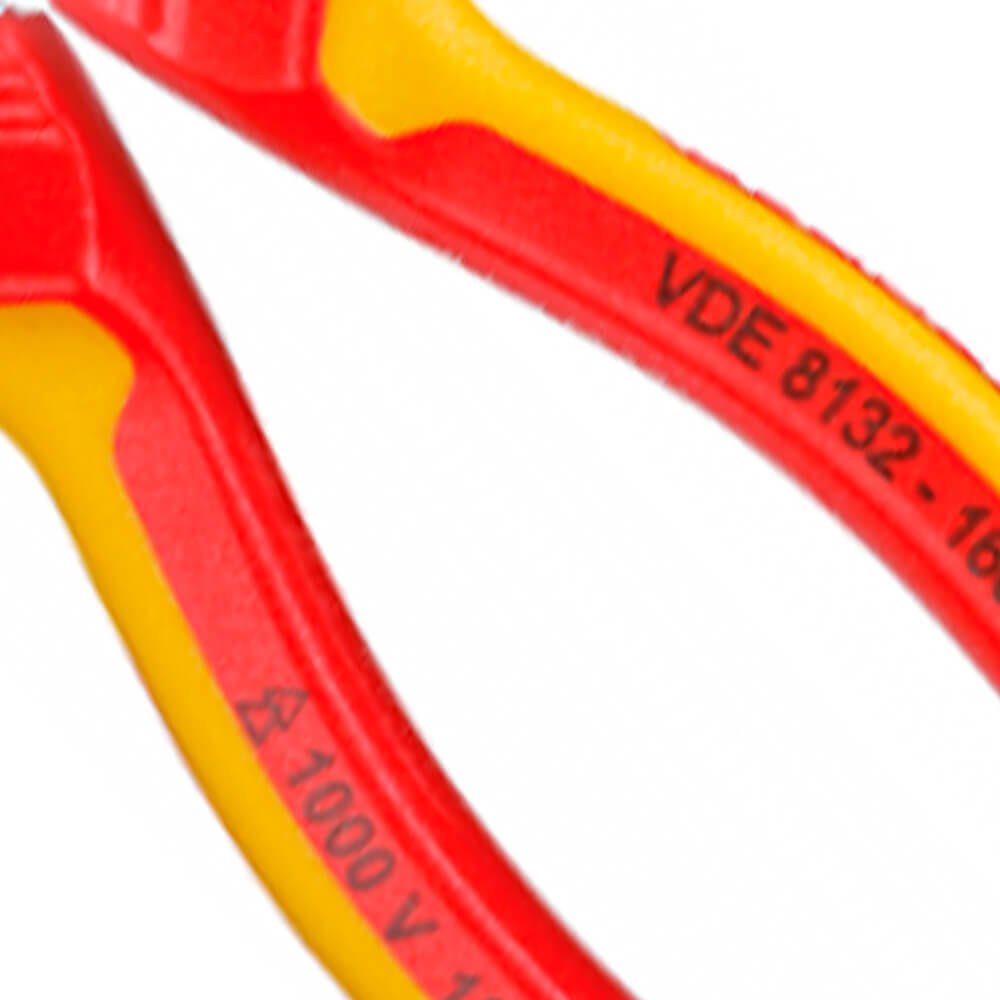 Atende com segurança a norma regulamentadora NR 10 - Segurança em Instalações e Serviços em Eletricidade, possui certificado de isolação. Tratamento térmico total e corte temperado por indução com dureza de 61 - 63 HRC. Alicate de bico semirredondo, longo e reto, com dentes finos e em paralelo, que permite cortar, puxar, segurar e dobrar fios. Indicado para corte de arame com dureza média, diâmetro máximo de Ø 1,6 mm e com resistência à tração 1600 N/mm². Para trabalhar em montagens e reparos eletroeletrônicos.