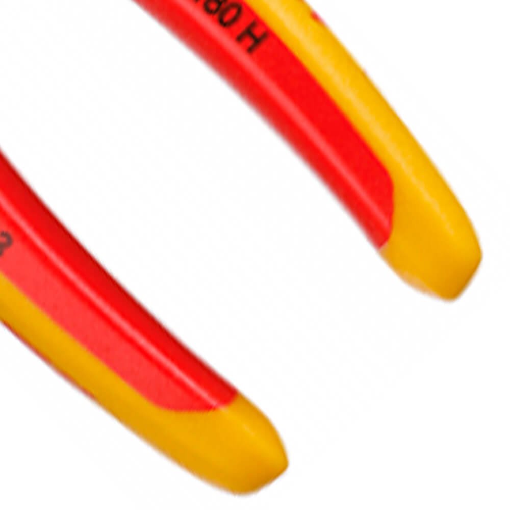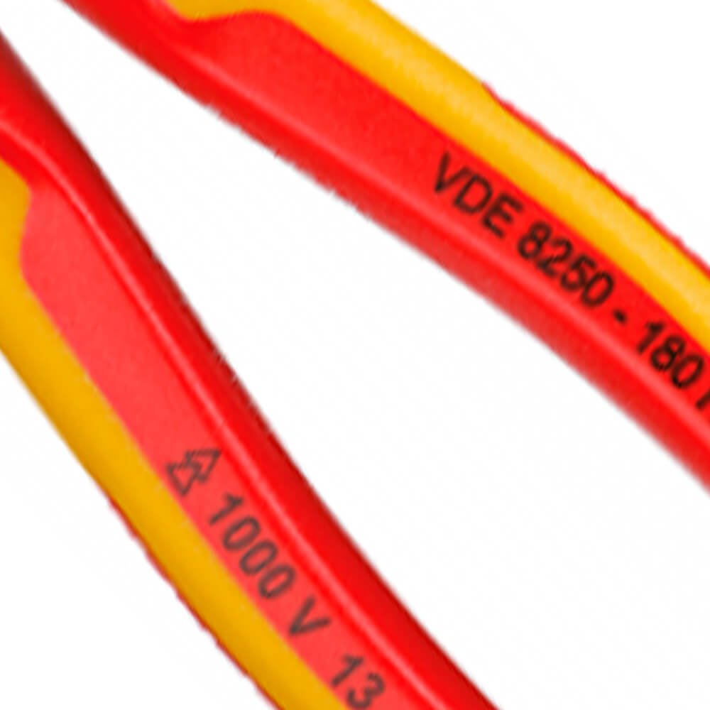 Permite cortar, puxar, segurar e dobrar fios. O sistema Kraft “Power Pliers”, permite capacidades mais elevadas de corte, com 35% menos de força do usuário, devido à combinação ótima da geometria de corte, alojamento excêntrico, grande efeito alavanca e design ergonômico da empunhadura. Propicia máximo rendimento e corte com mais facilidade. As mandíbulas planas e ovaladas permitem segurar com firmeza superfícies com forma chata, cilíndrica, oval, quadrada, sextavada, oitavada ou poligonal. Propicia máximo rendimento com corte mais facilitado. Indicado para cortar todos os tipos de arame, inclusive corda de piano com diâmetro máximo de Ø 1,6 mm e com resistência à tração 2300 N/mm². O alicate Ref. VDE 8250 - 200 H é fornecido em blister para autosserviço.