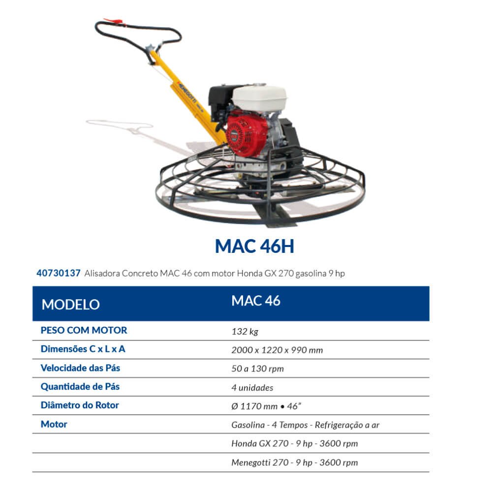 Alisadora de Concreto MAC 46 com Motor Honda 9HP - Menegotti