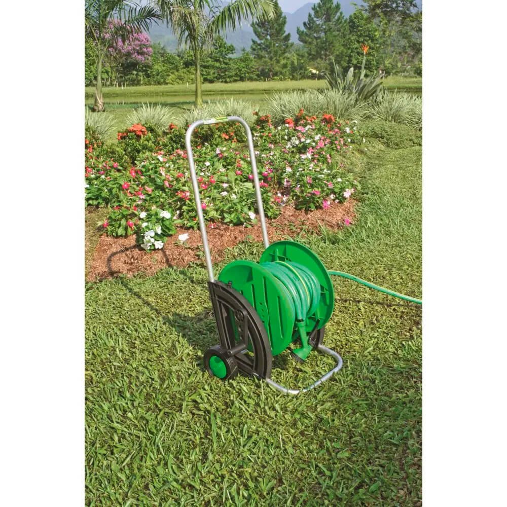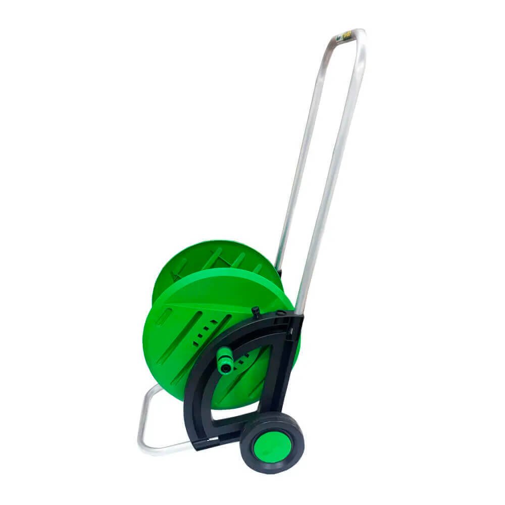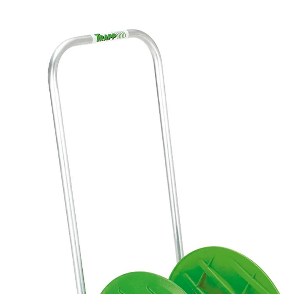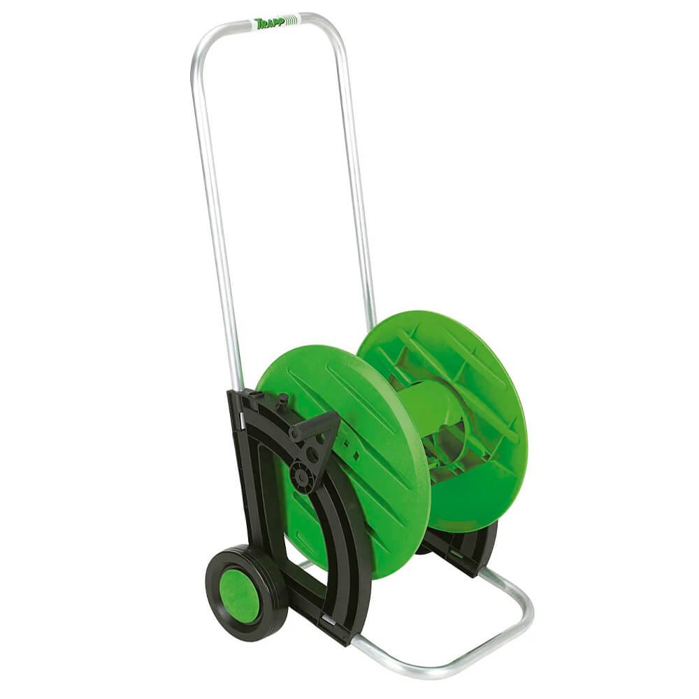 O Enrolador de Mangueira da Trapp possui rodas e funciona como um carrinho para enrolar mangueira de jardim. Possui manivela lateral para enrolar e desenrolar e é capaz de acondicionar até 50 metros de mangueira.