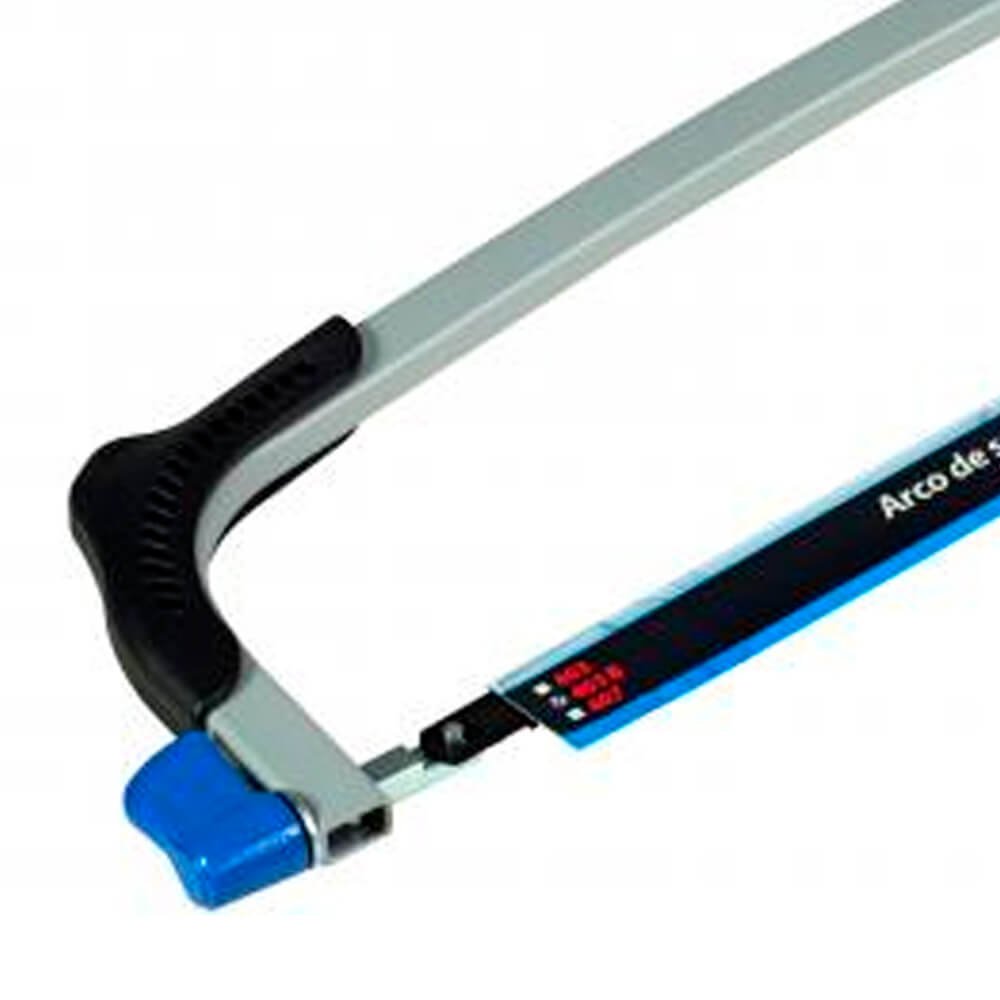 Corpo em alumínio e proteção em polímero. Acabamento em pintura eletrostática. Produto leve, de alta resistência e empunhadura ergonômica. Arco exclusivo para lâminas de 12”. Cabo fechado para maior proteção do usuário. Pode ser usado com lâmina na vertical ou com ângulo de 90º em relação ao arco. Possui um tensor para aperto e desaperto da lâmina.