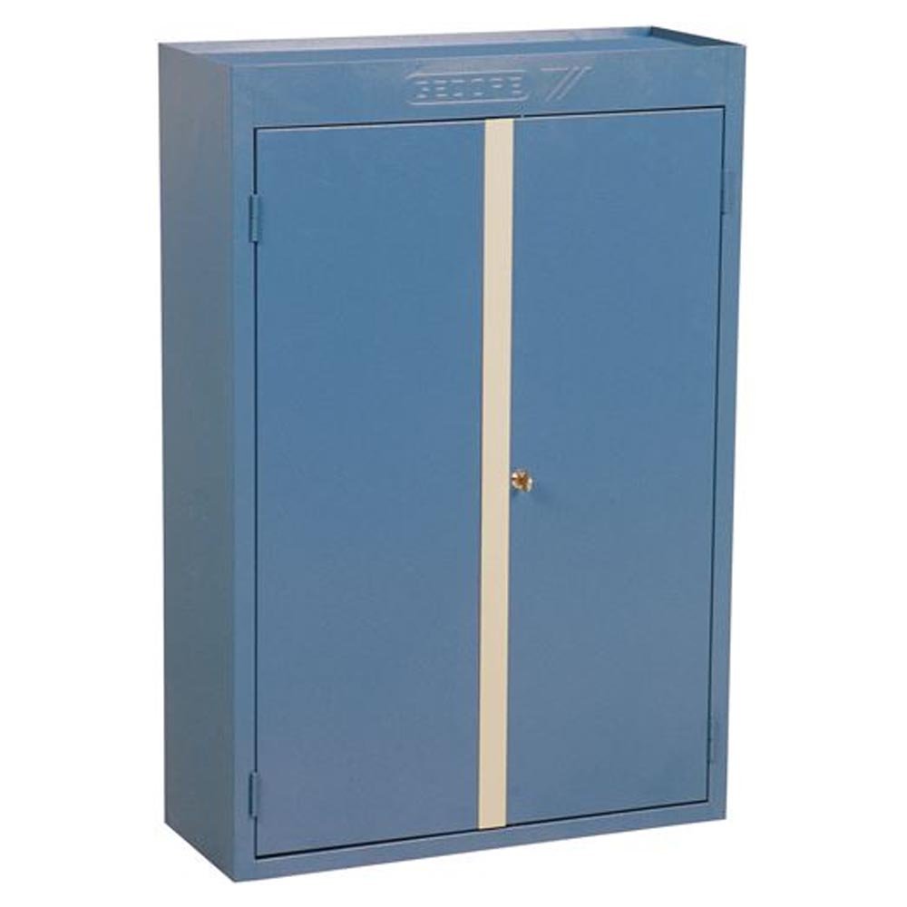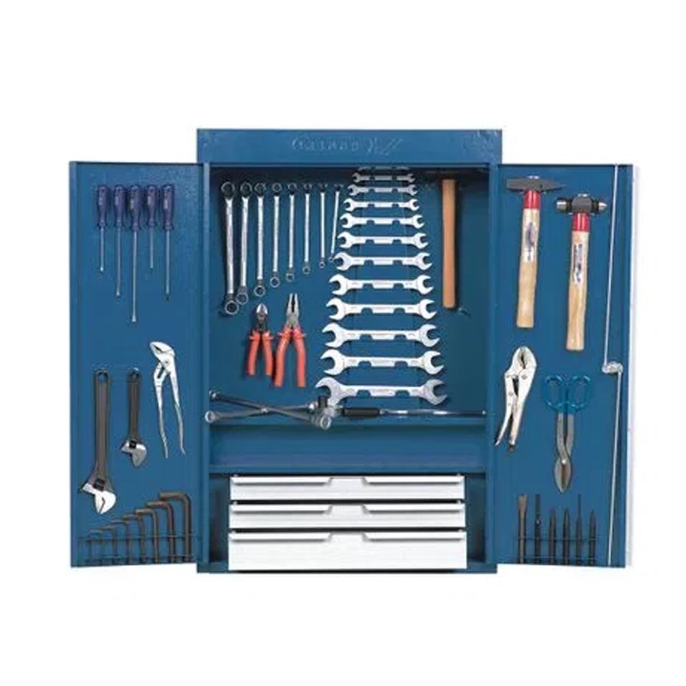 Em chapa reforçada de aço especial. Acabamento em pintura na cor azul padrão Gedore. Armário resistente e soldado. O 1400 é equipado com 3 gavetas internas, suportes e ganchos fixos para organização das ferramentas e fechadura central, com 2 cópias de chaves. É ideal para armazenar ferramentas utilizadas nas oficinas de manutenção de veículos, máquinas e outras aplicações. Armário possui dois furos com diâmetro de 16 mm, na parte de traz, para fixação na parede. Fornecido sem ferramentas.