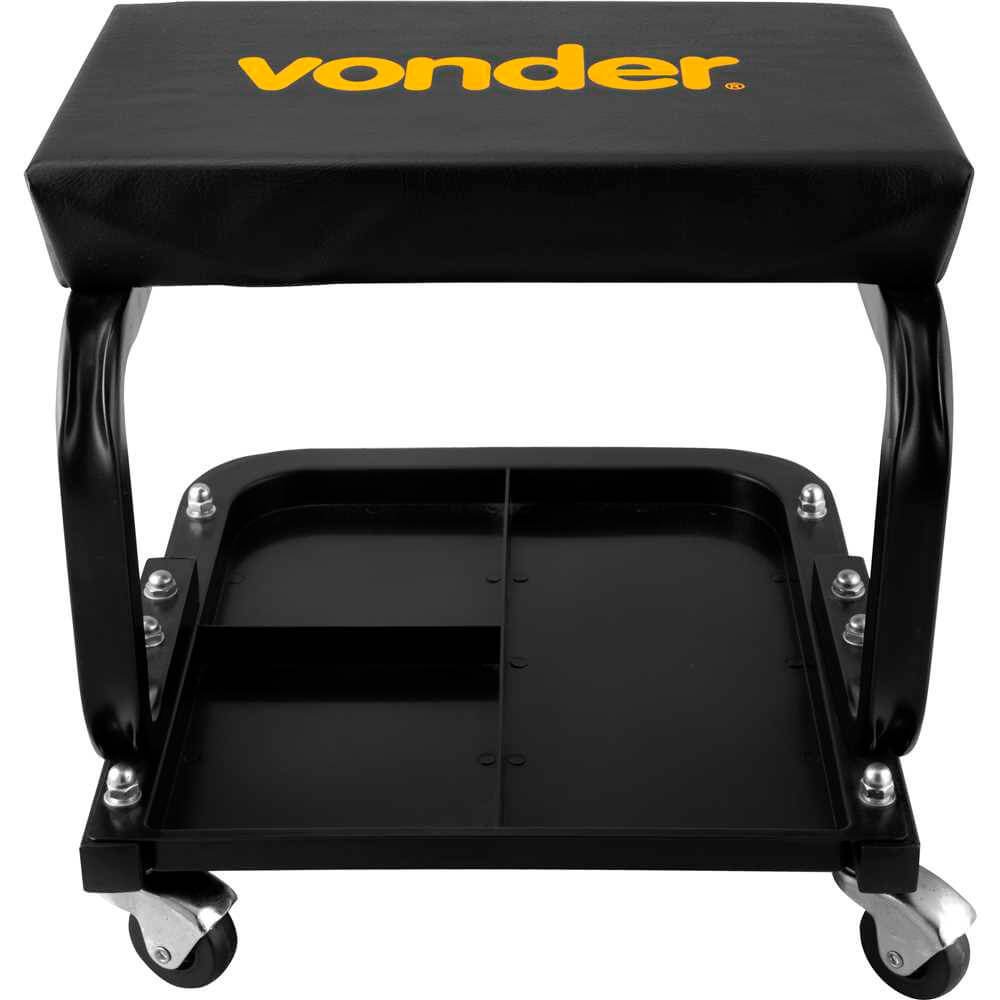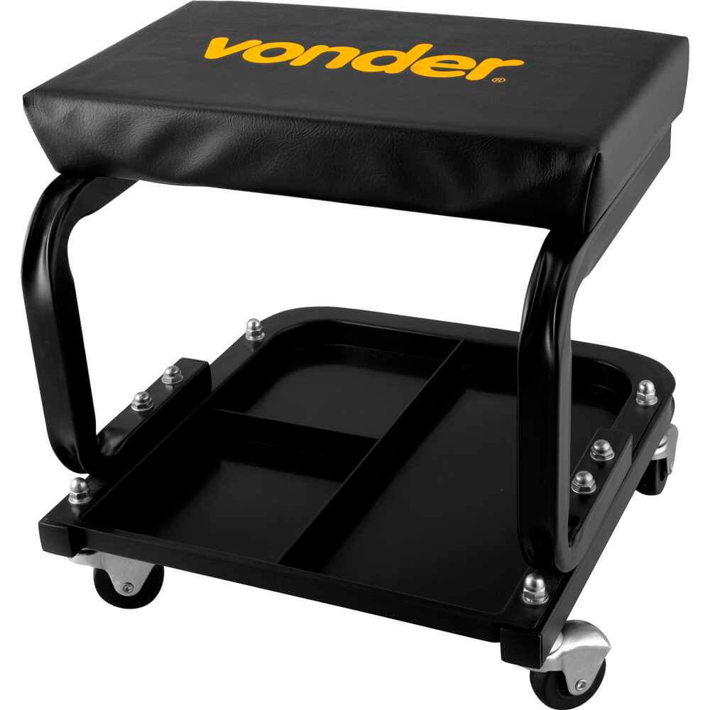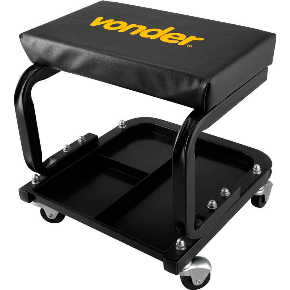 Possui estrutura em aço carbono, assento almofadado, bandeja porta-ferramentas e 4 rodízios giratórios independentes.
