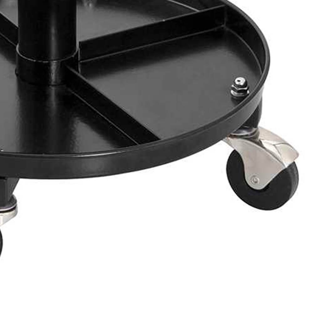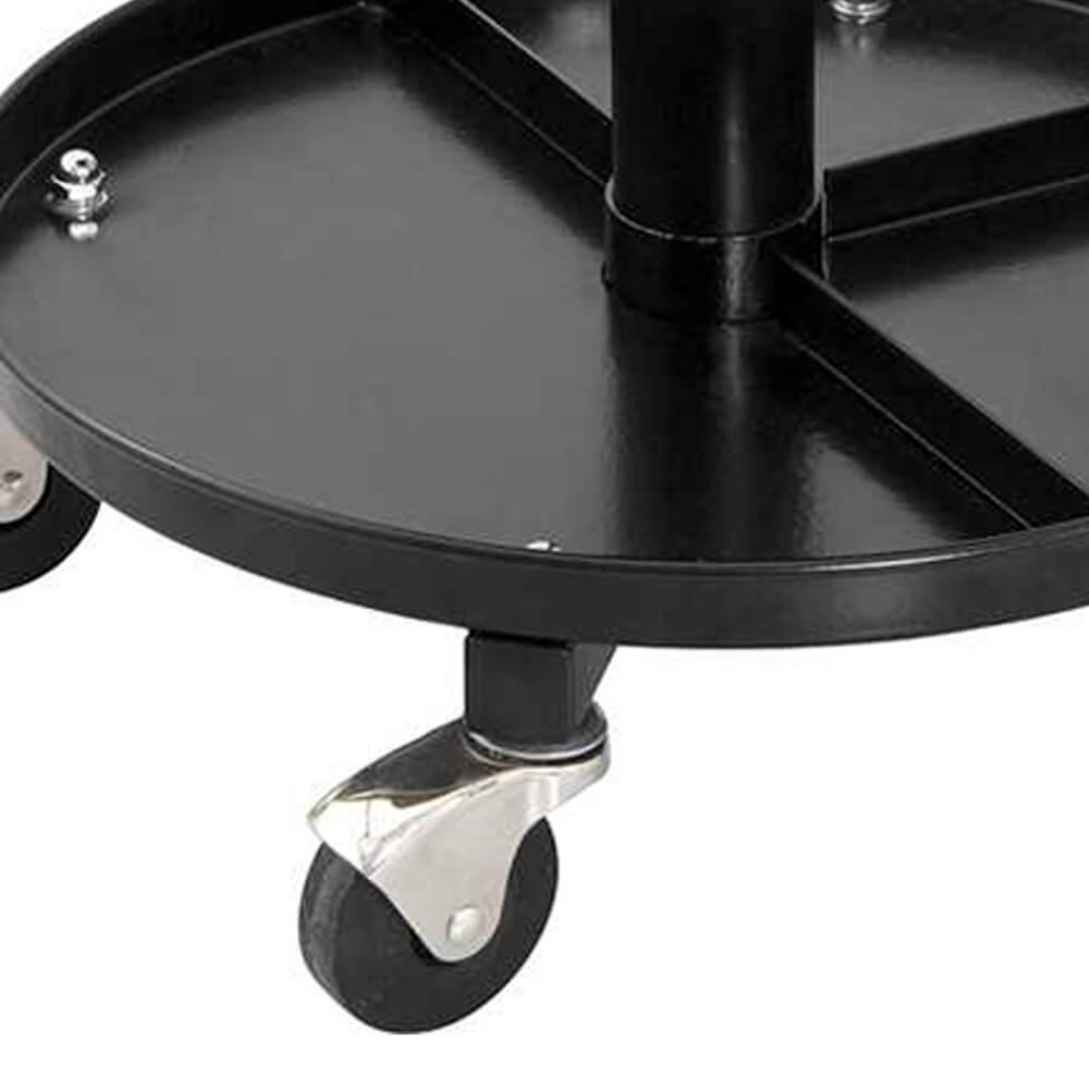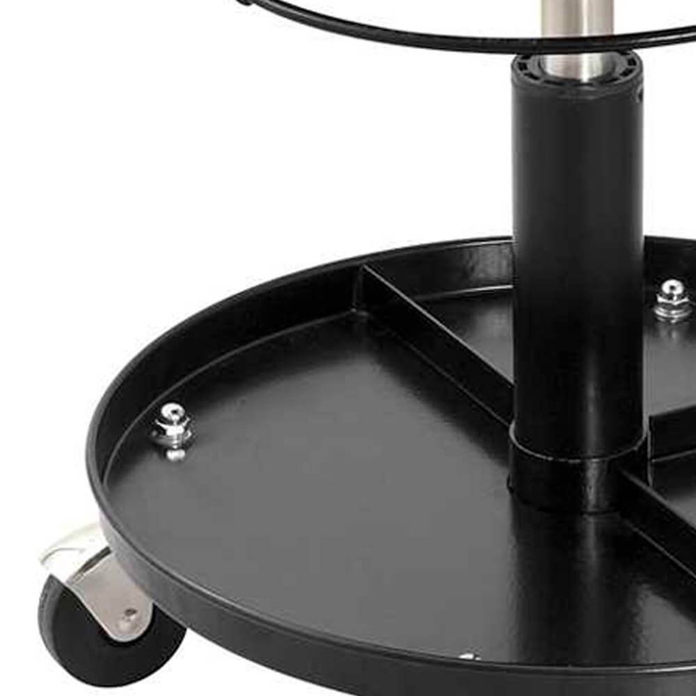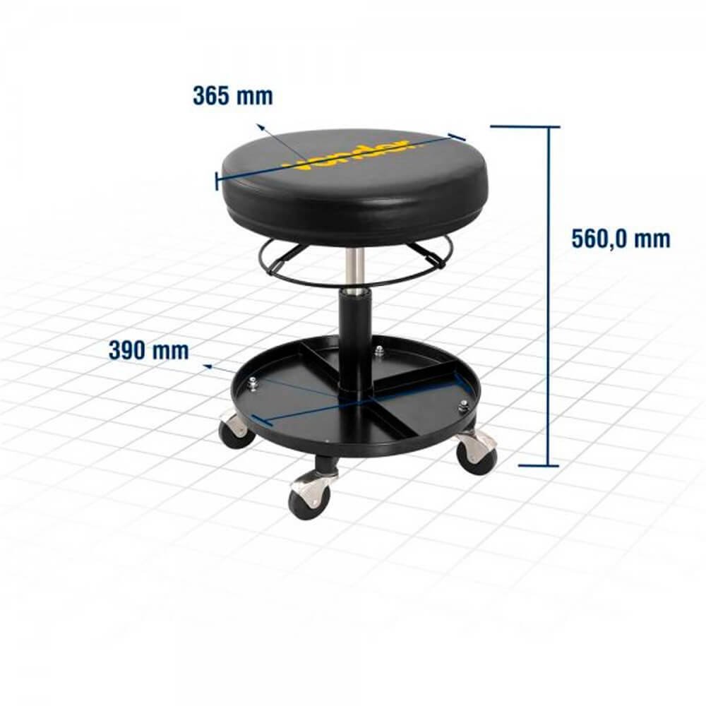 Possui bandeja porta-ferramentas, assento giratório acolchoado com alavanca para regulagem de altura, rodízios giratórios independentes e cilindro pneumático.