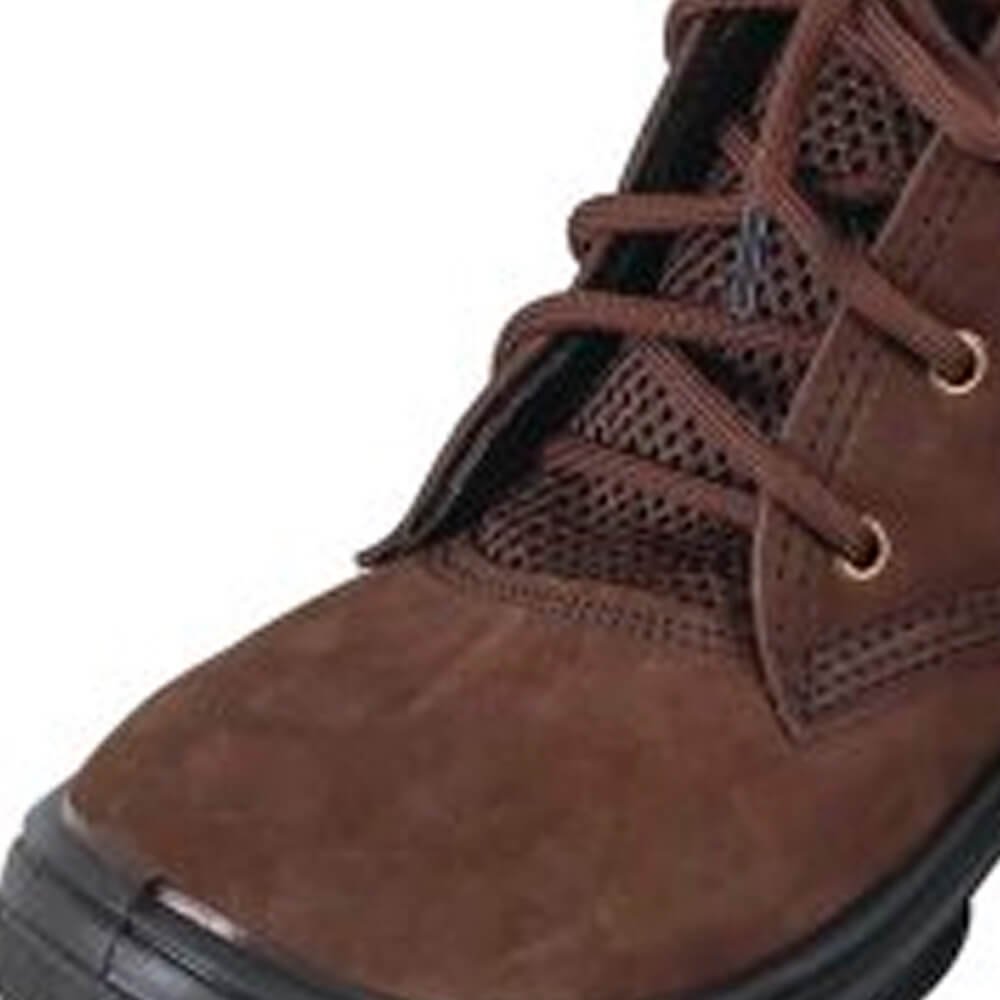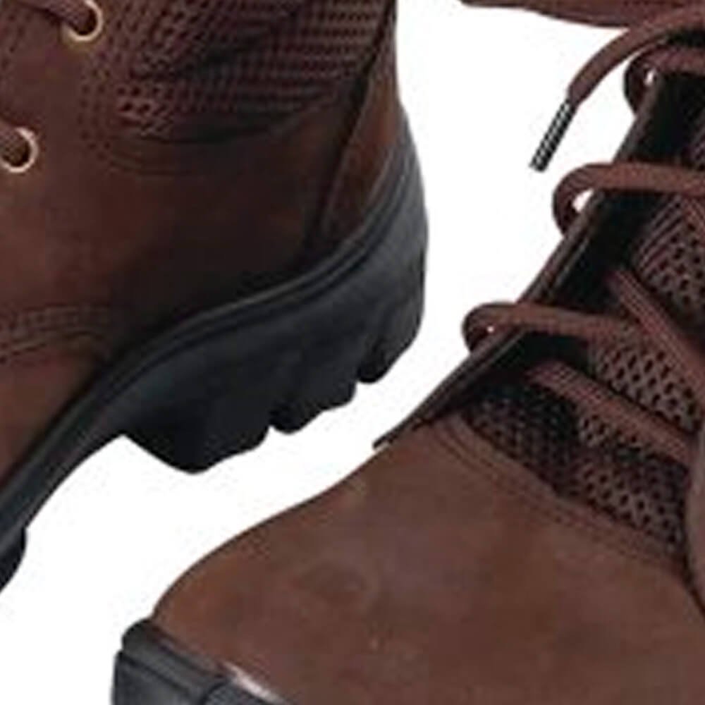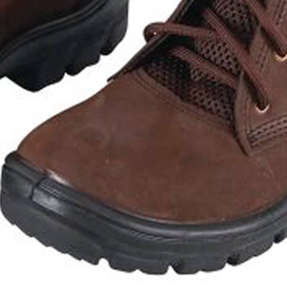 Botina Amarrar para proteção dos pés do usuário. Botina de amarrar Imbiseg, em couro nobuck, marrom, com lingueta e colarinho microperfurado em dupla frontura, ilhoses e cadarço em poliéster,solado em poliuretano. Forração em não tecido transpirável. Palmilha de montagem sintética, não tecido, costurada pelo sistema strobel.