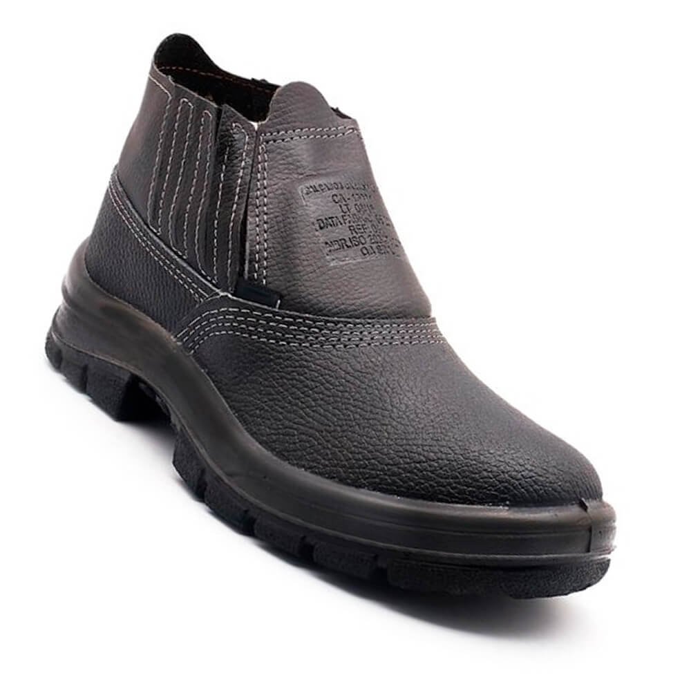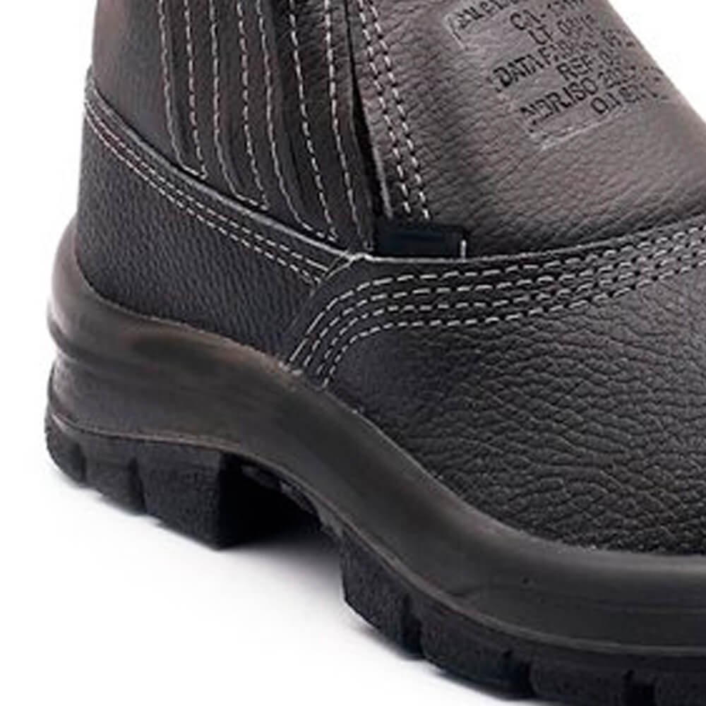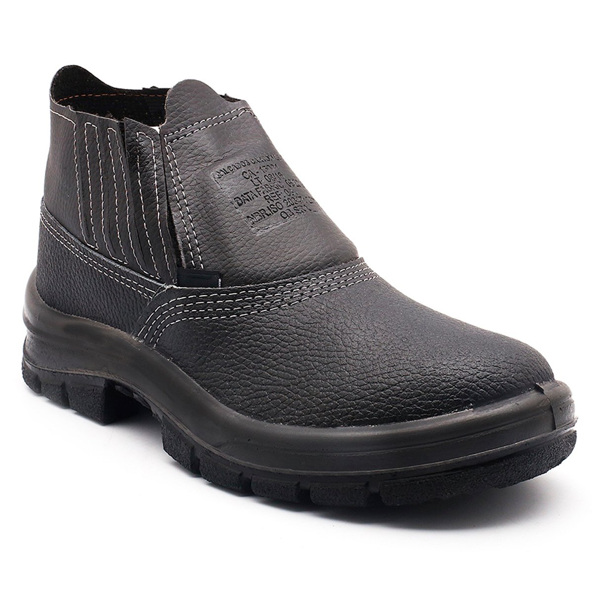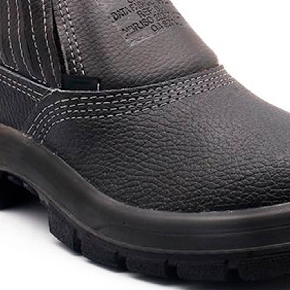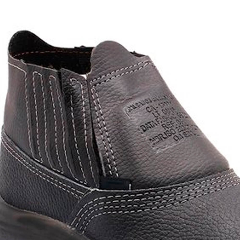 Botina de elástico, 100% couro, preta, com solado em poliuretano. Forração em não tecido transpirável, dorso acolchoado e palmilha de montagem sintética em não tecido costurada pelo sistema strobel. Acompanha sobrepalmilha em EVA, removível, dublada em tecido para absorção do suor.