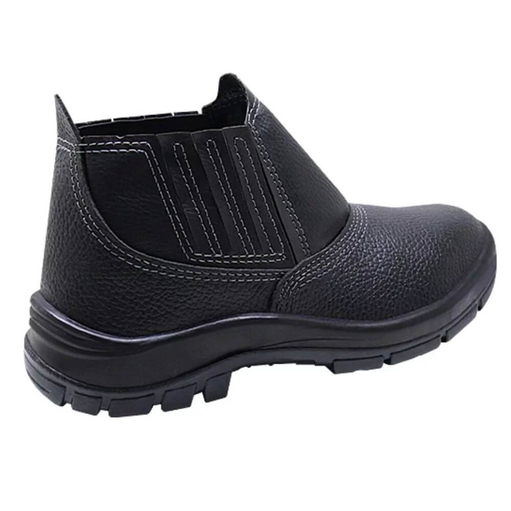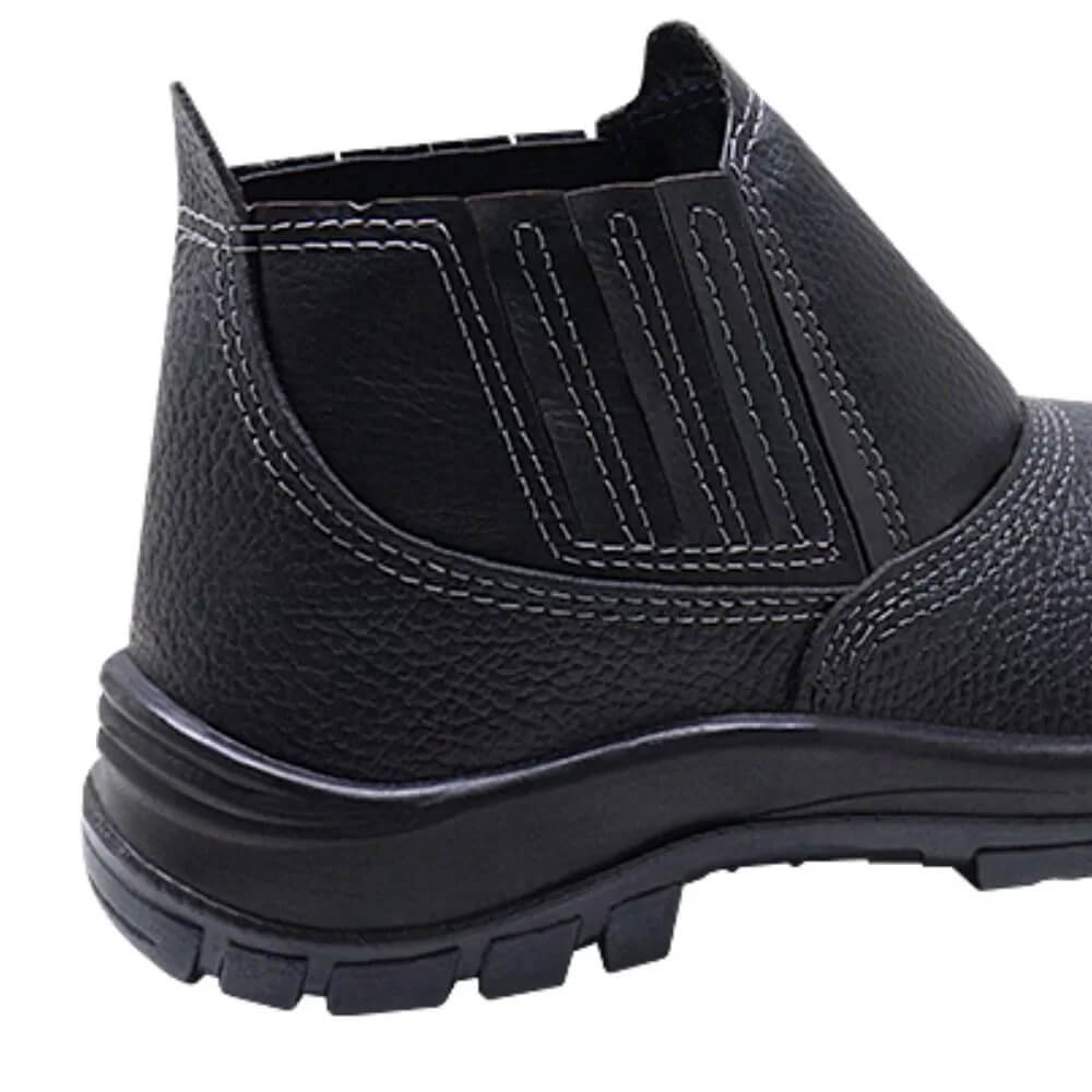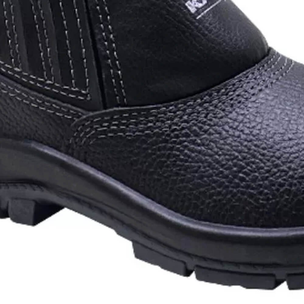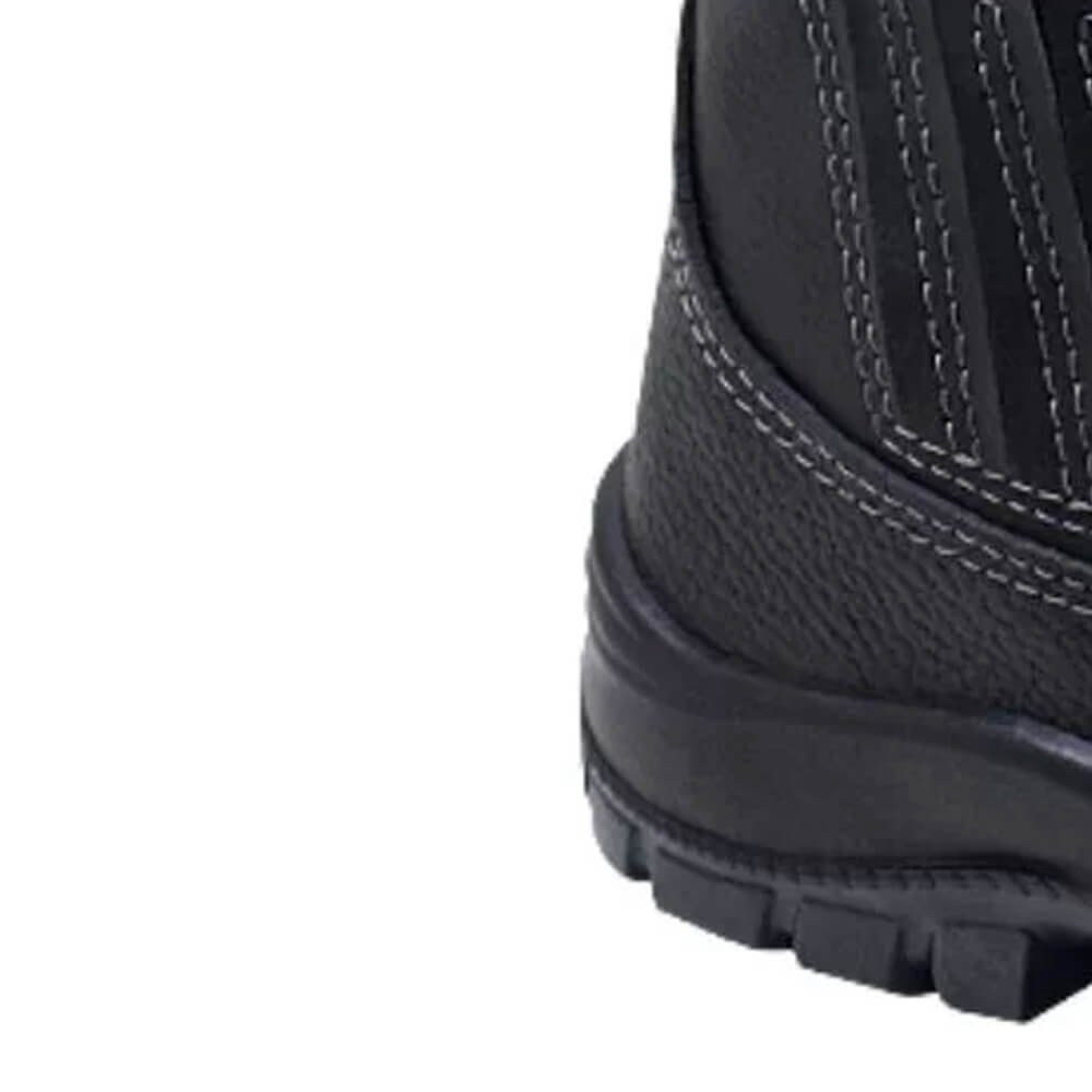 Botina de elástico, linha Combat, 100% couro, preta, com solado em poliuretano. Forração em não tecido transpirável, dorso acolchoado e palmilha de montagem sintética em não tecido costurada pelo sistema strobel. Acompanha sobrepalmilha em EVA, removível, dublada em tecido para absorção do suor.