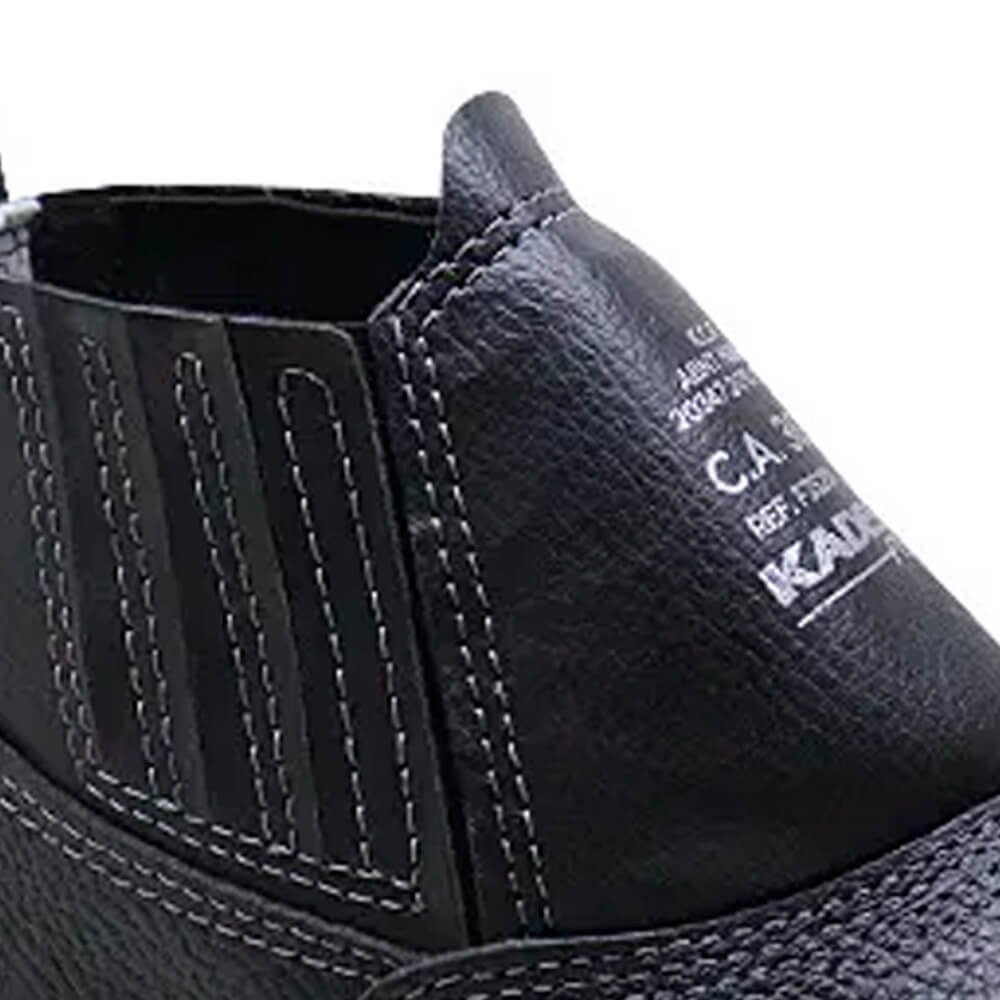 Confeccionado em couro, com dorso e colarinho em material sintético, fechamento em elástico lateral, e costuras simples, duplas e quádruplas.