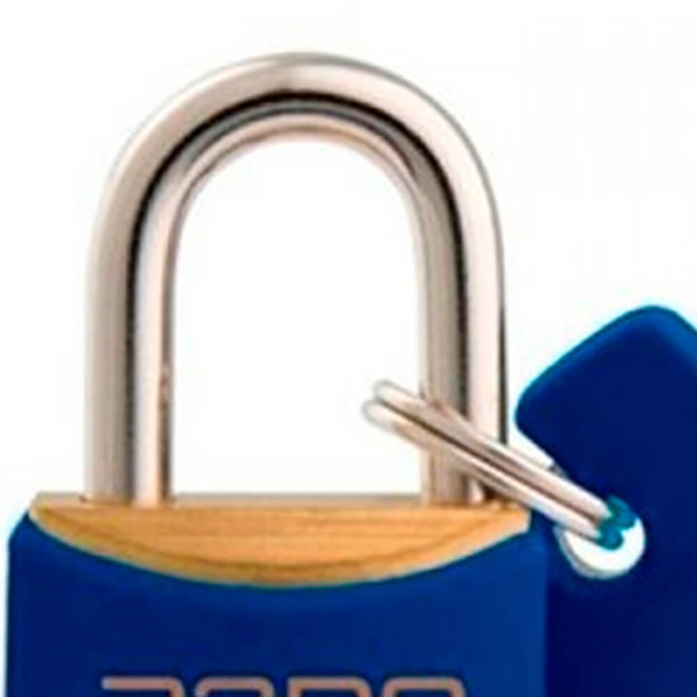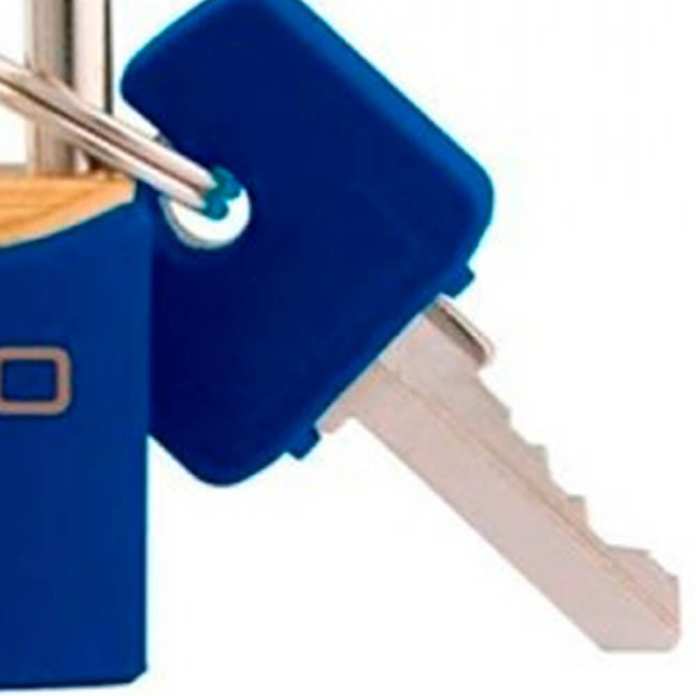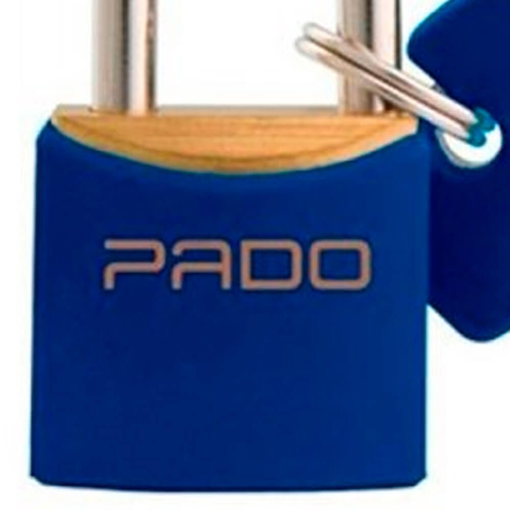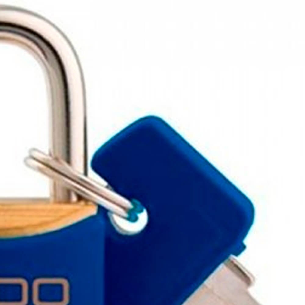 Cadeado E-25 Azul Pado, fabricado em Corpo em latão maciço e chave em latão revestido por capa plástica colorida com haste em aço; É ideal para portões e janelas, com acesso ao registro de luz e caixa de correio;