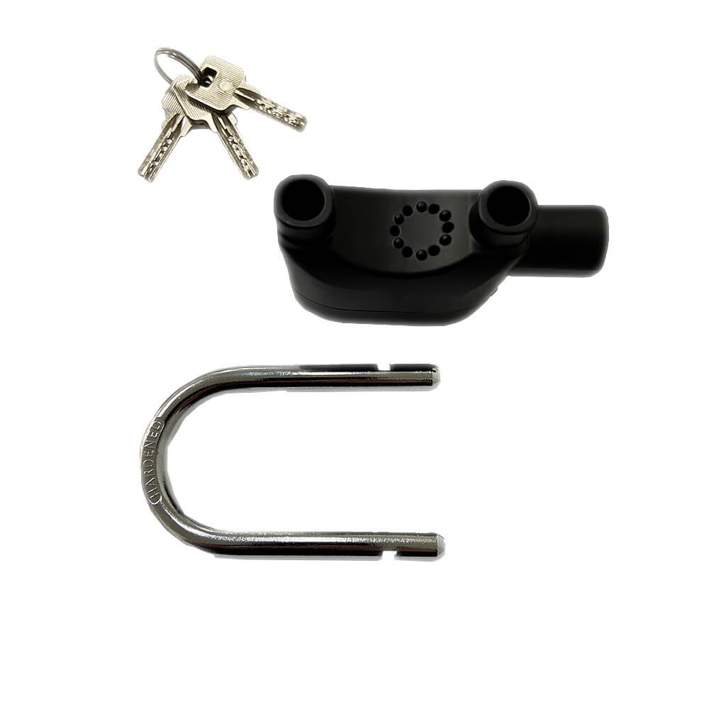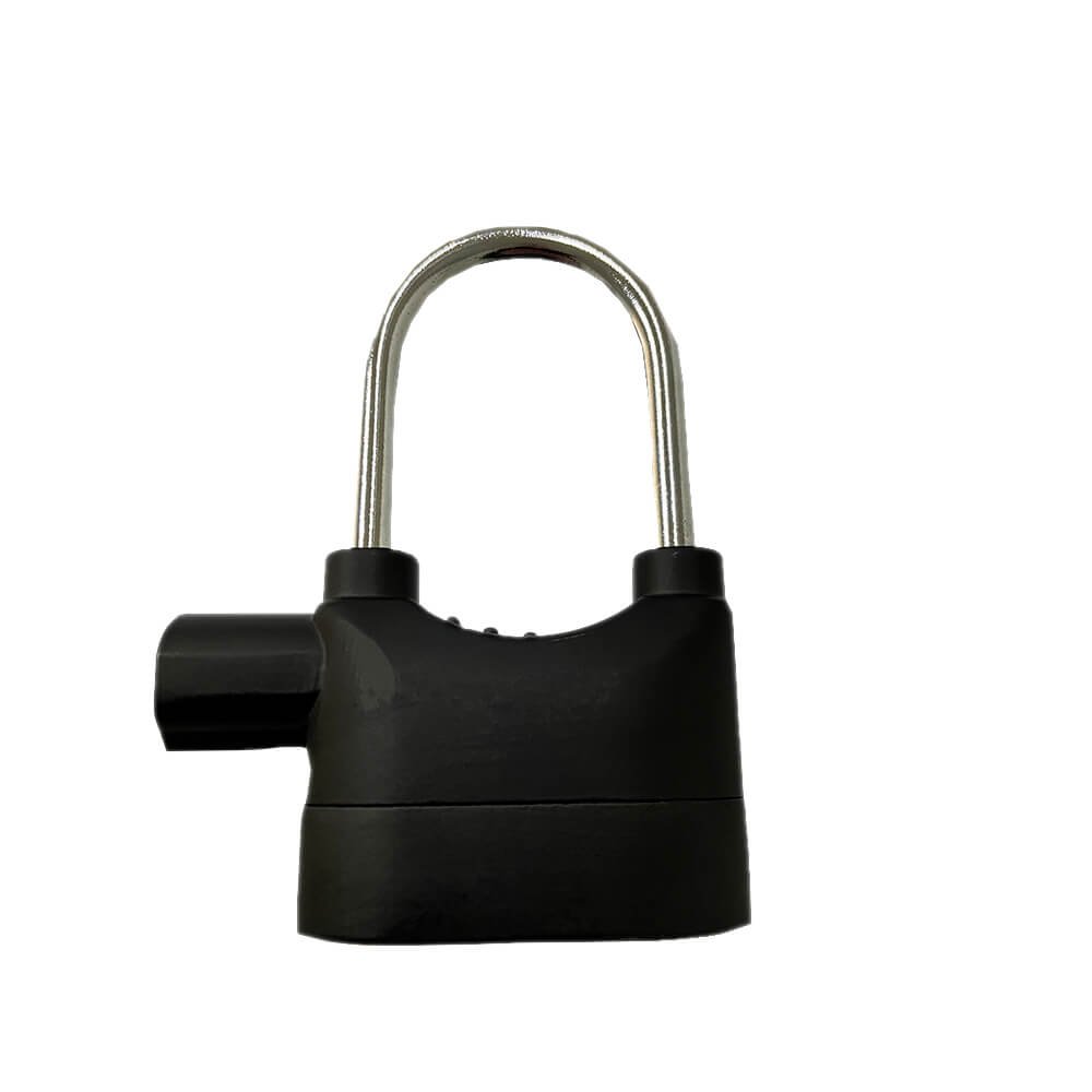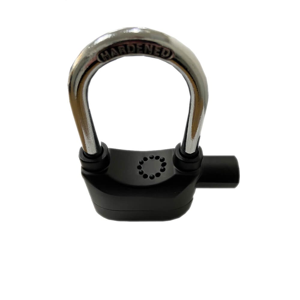 Cadeado preto com alarme na parte superior.