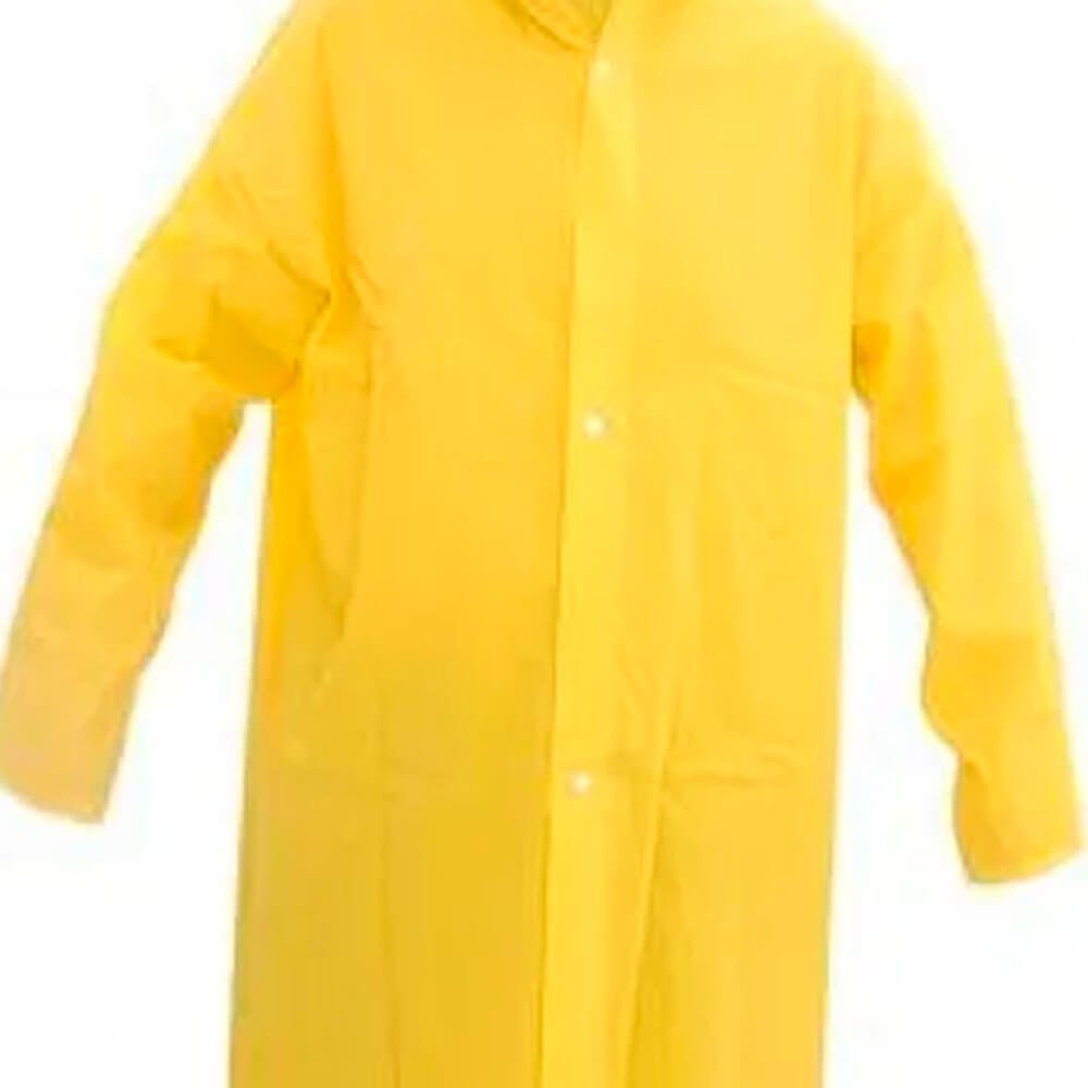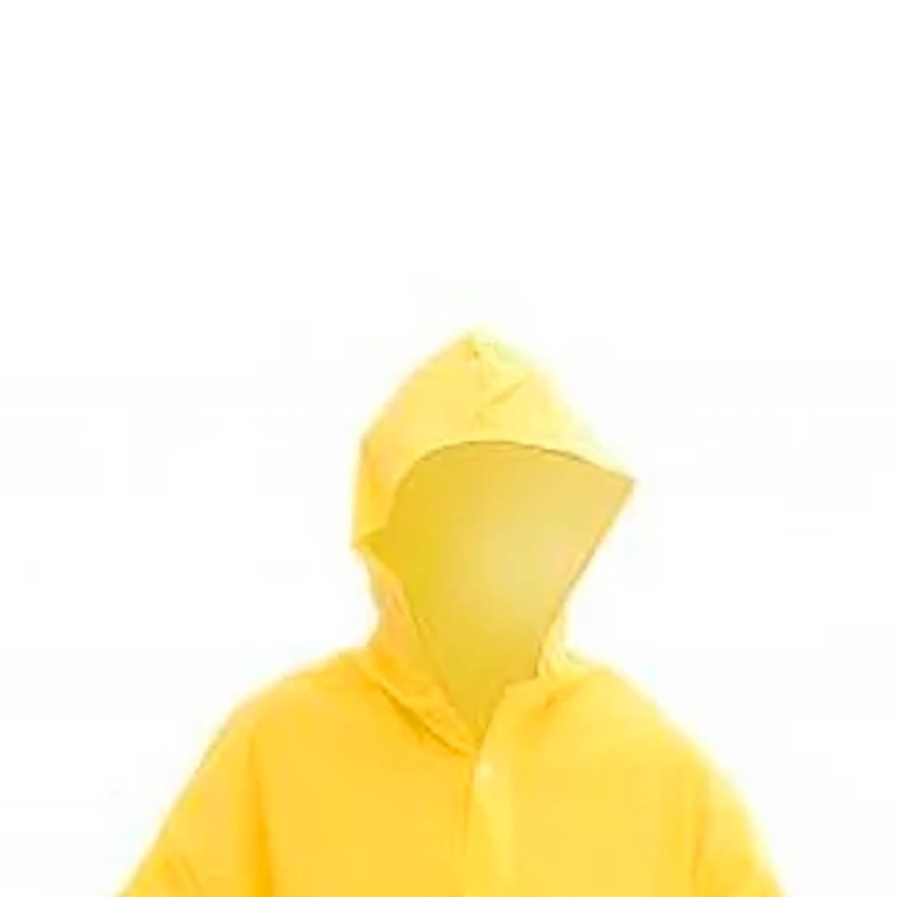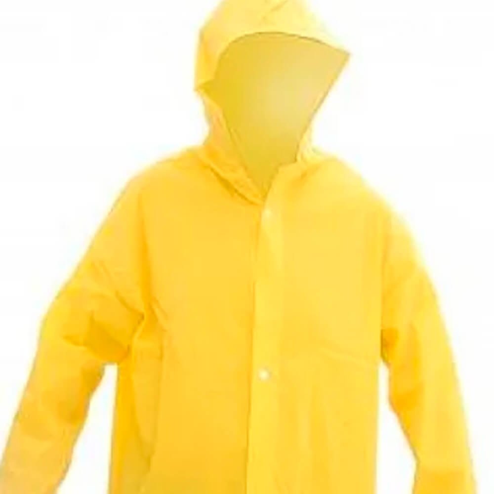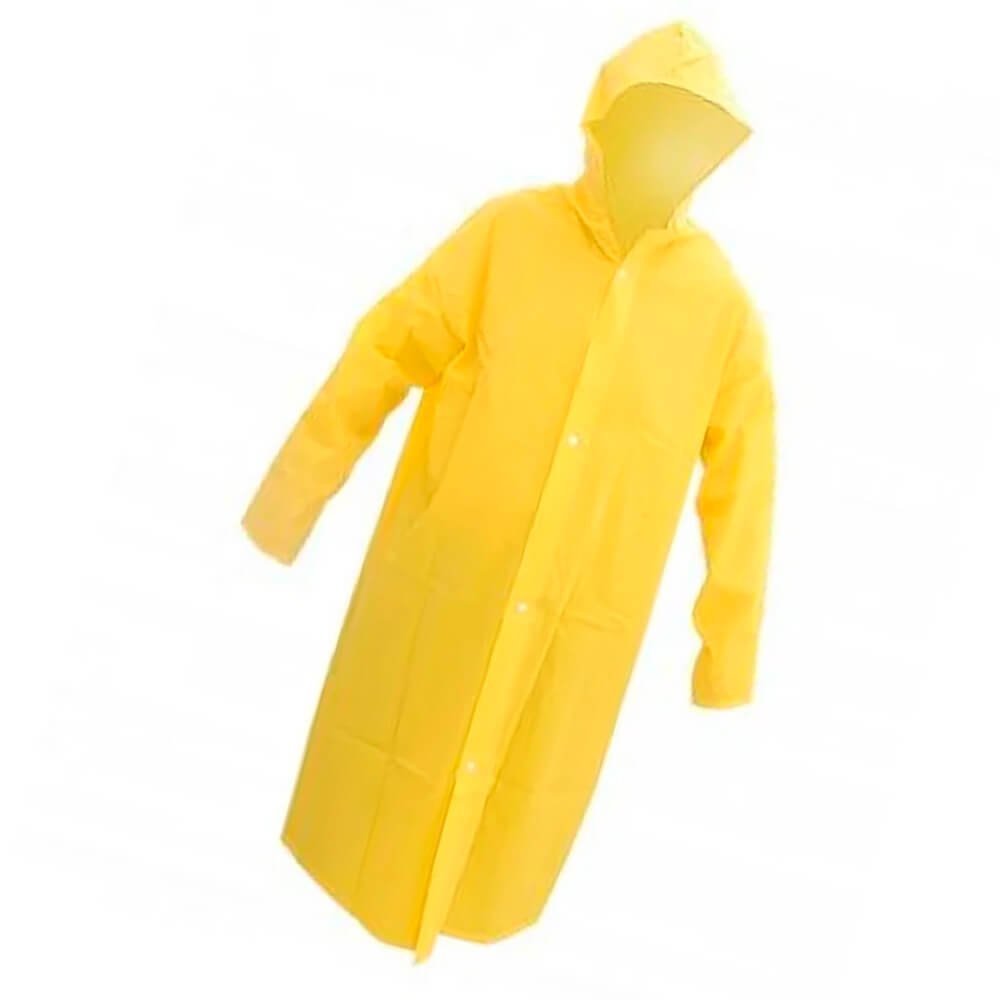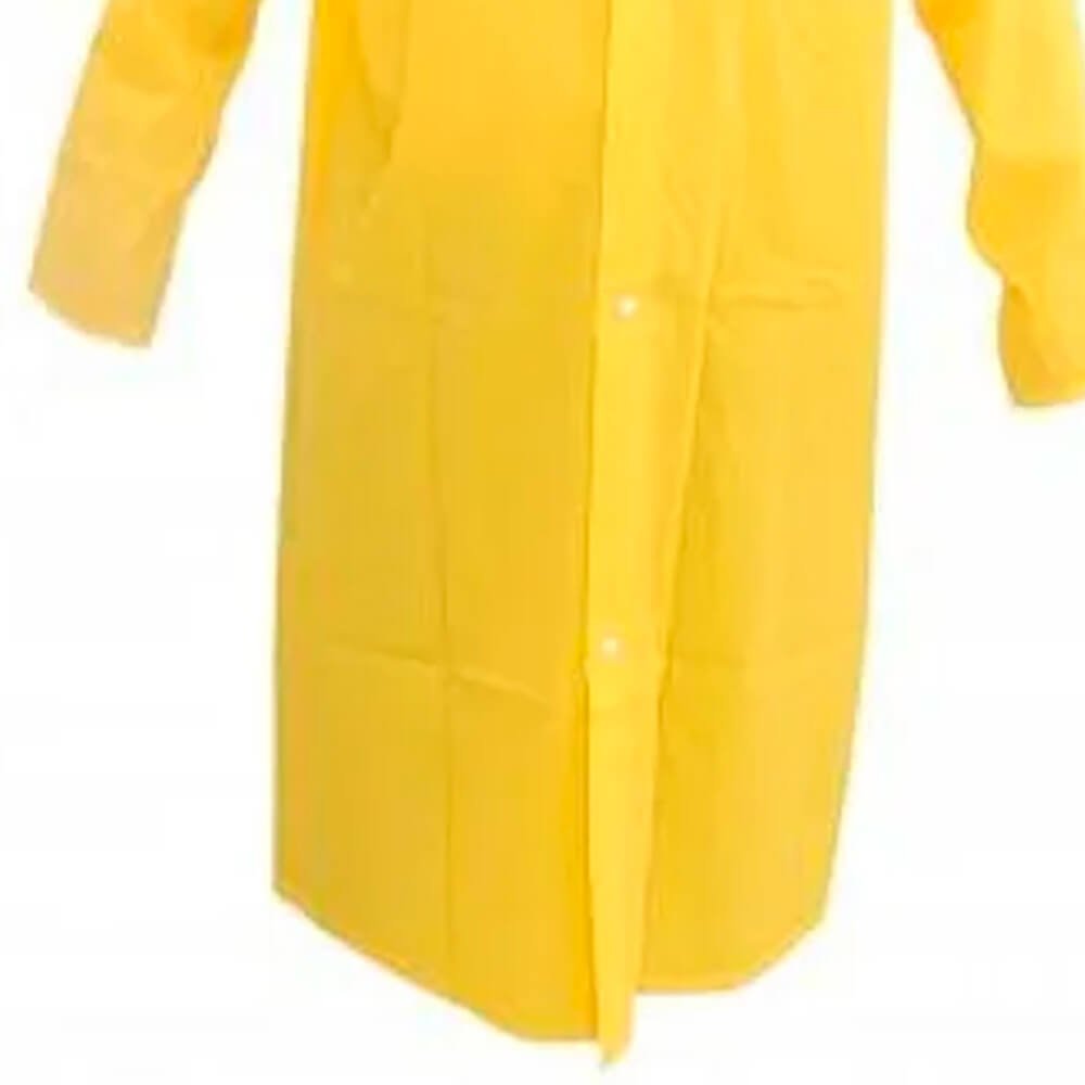 Capa de chuva confeccionada em laminado de PVC forrado, com capuz e mangas compridas, fechamento frontal com 4 botões de pressão e costuras através de solda eletrônica. Vestimenta de segurança estilo capa confeccionada em tecido sintético plastificado em frente e verso desenvolvida com solda eletrônica. Fechamento com botões plásticos de pressão. Produto 100% impermeável.