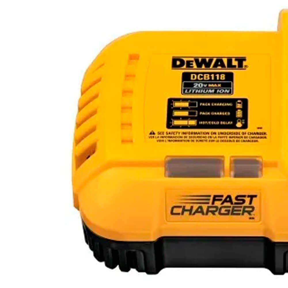 Carregador para baterias 20V/60V tem saída de corrente 8A permite carregar a bateria Flexvolt DCB606 em 60 minutos. Sistema de resfriamento por cooler sopra ar enquanto carrega a bateria, acelera o processo de carga.