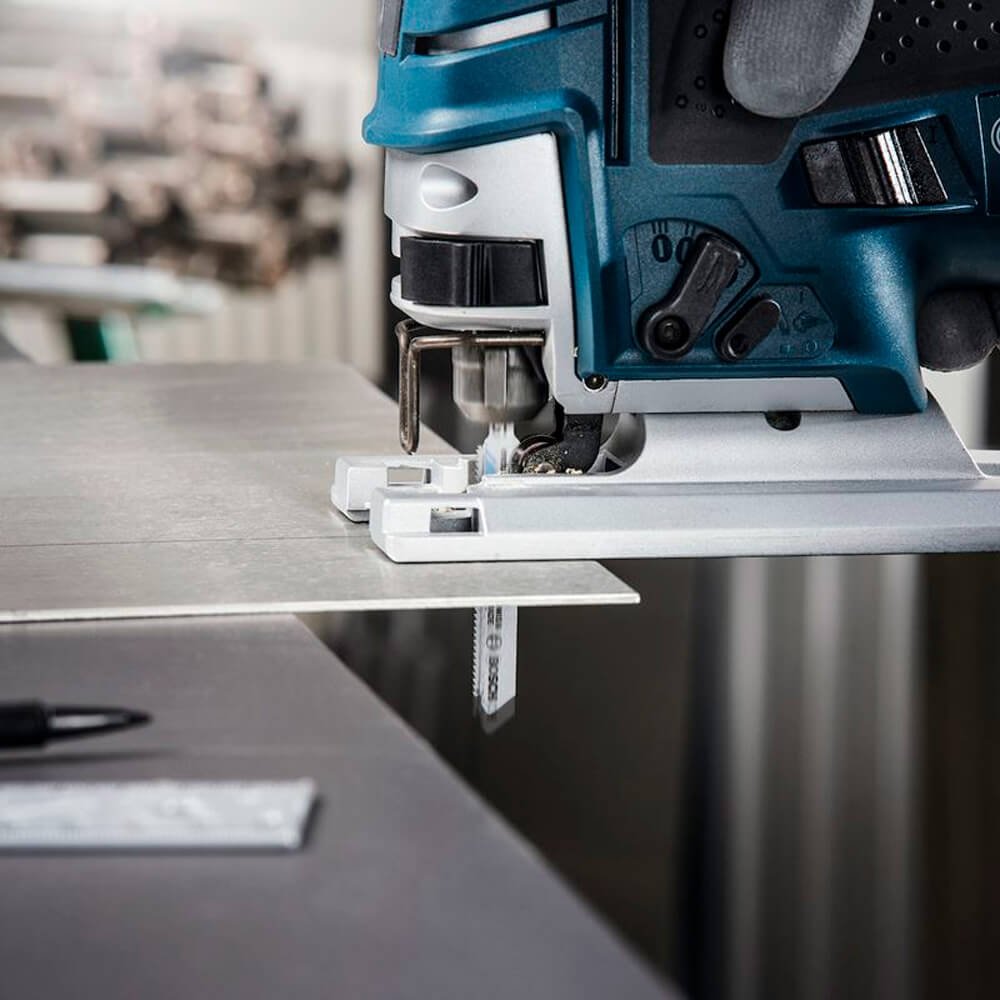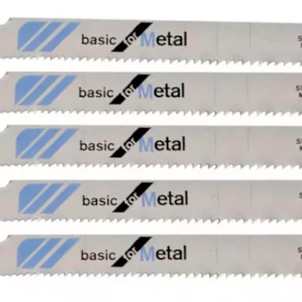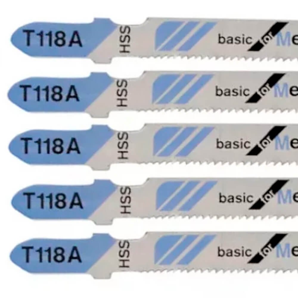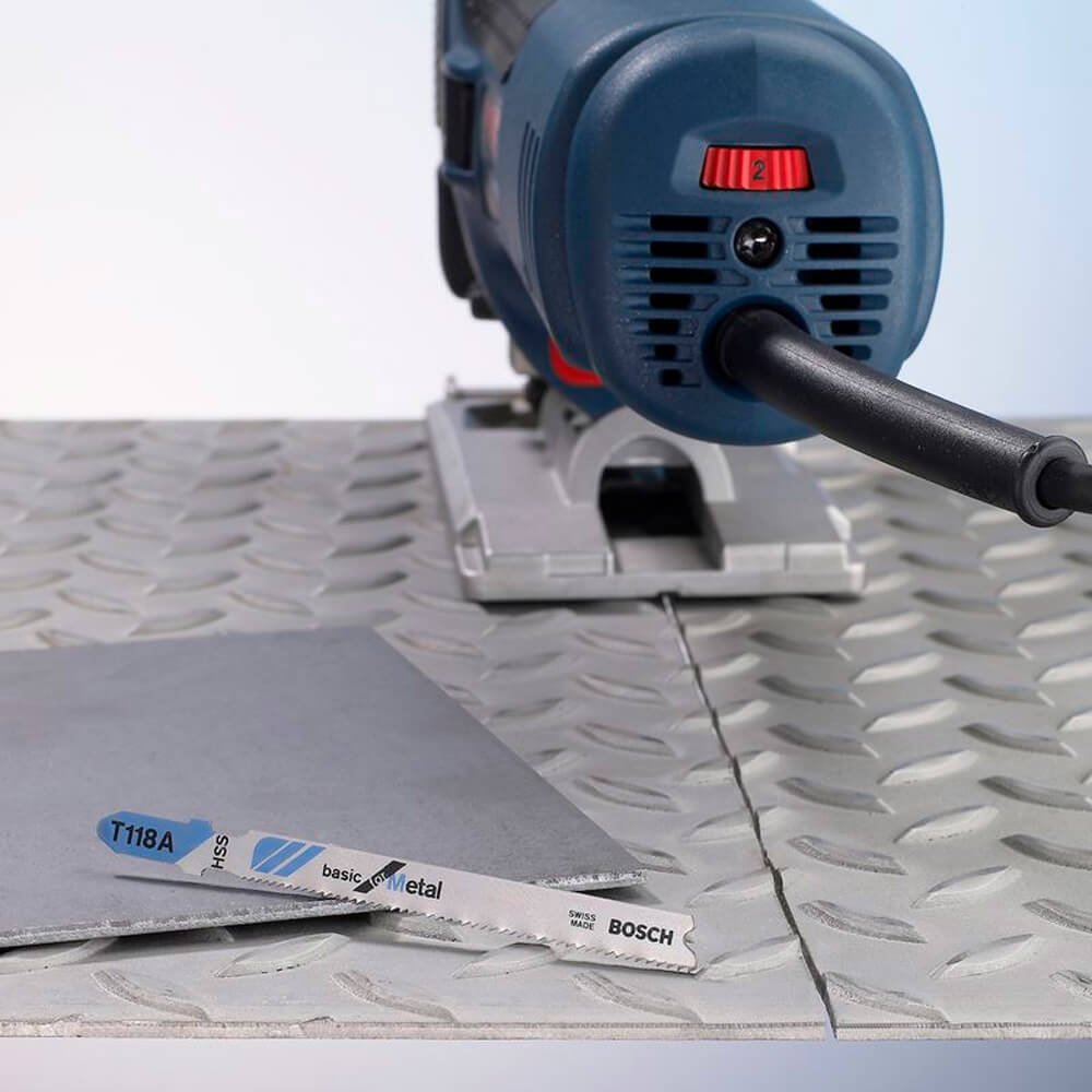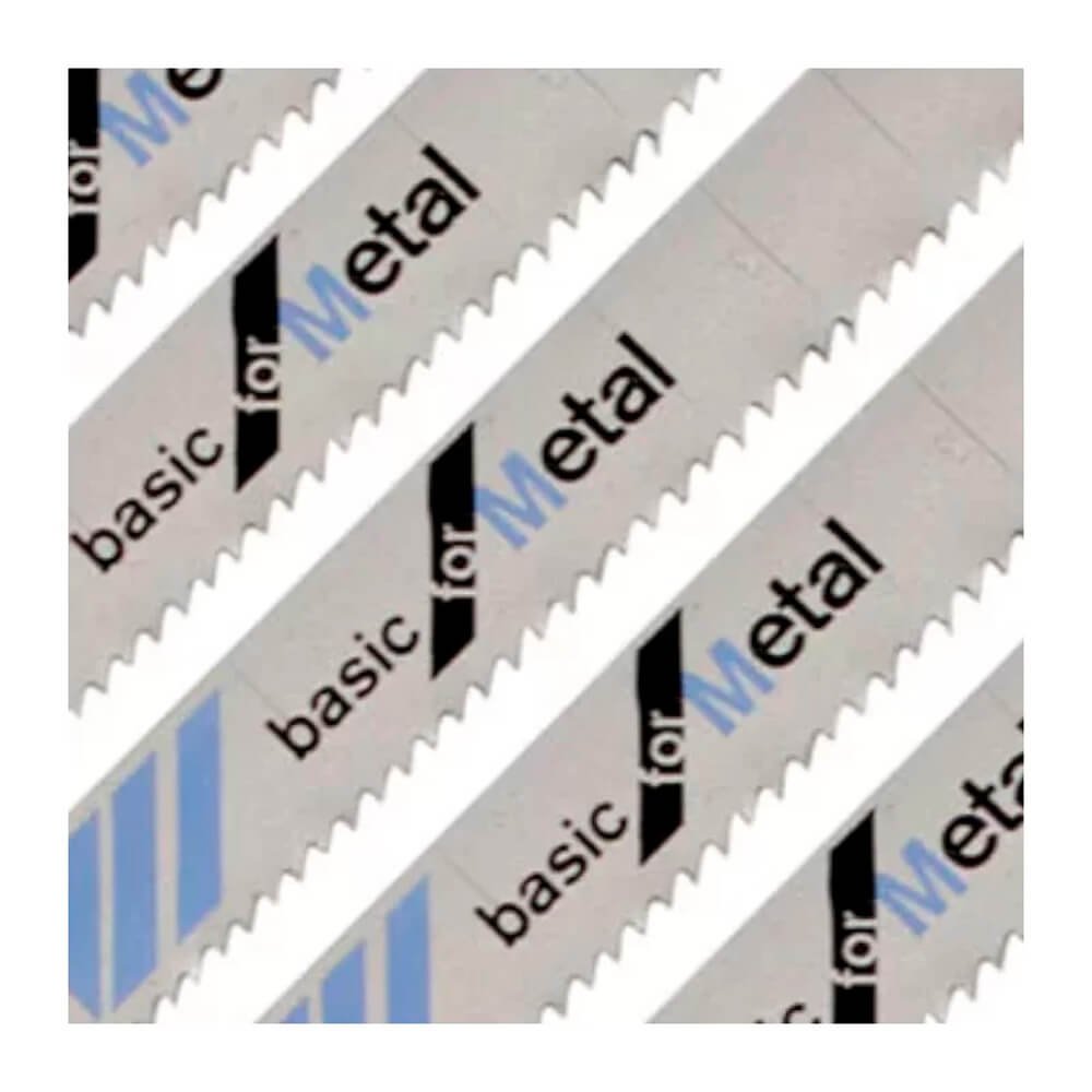 A lâmina de serra tico tico T118A Basic for Metal faz cortes retos no metal. Os seus dentes ondulados fresados são ideais para cortes diretamente no material.O material da lâmina em aço rápido endurecido (HSS) de alta qualidade permite o corte de chapas metálicas não perfuradas, de dureza comum. Além disso, o passo dos dentes progressivo muito fino da lâmina (1,1-1,5 mm) corta chapas metálicas sólidas muito finas com 1-3 mm de espessura. Para utilizar com serras tico tico compatíveis com encaixe em T.