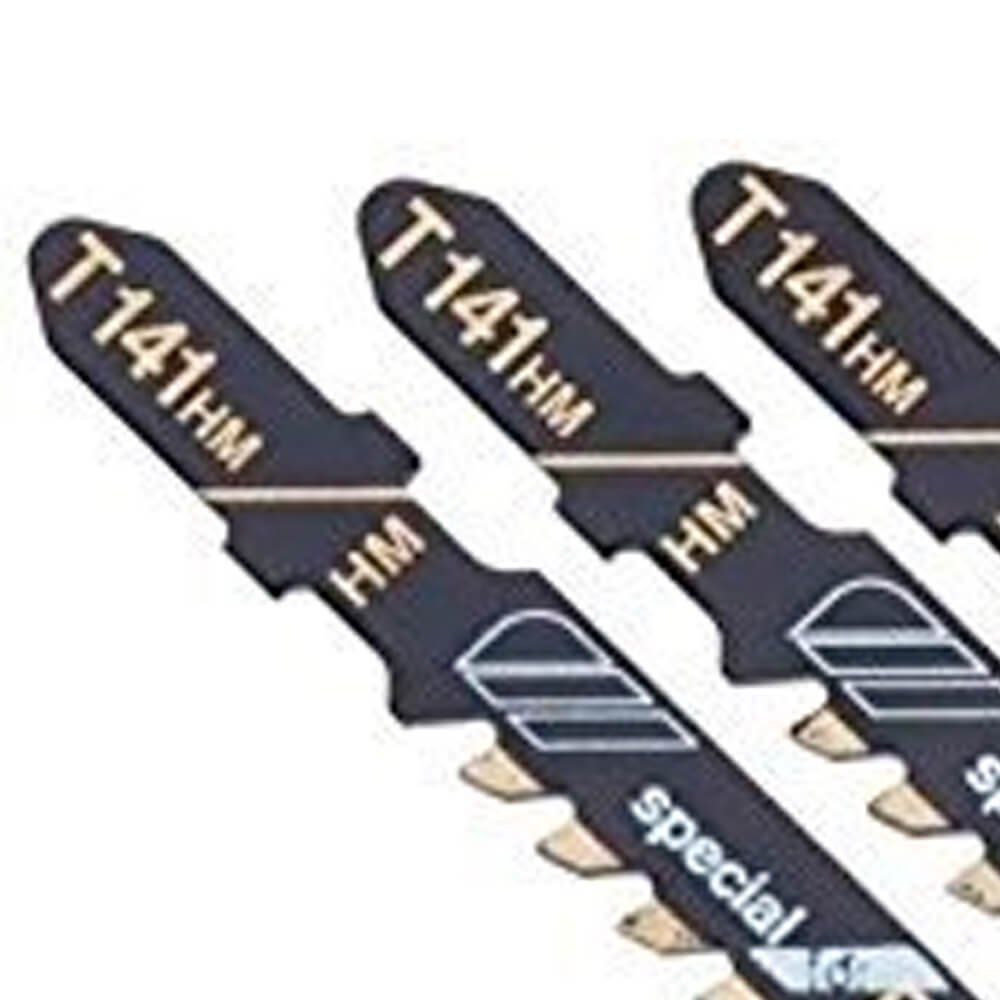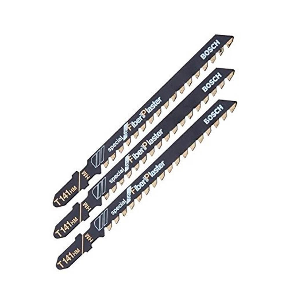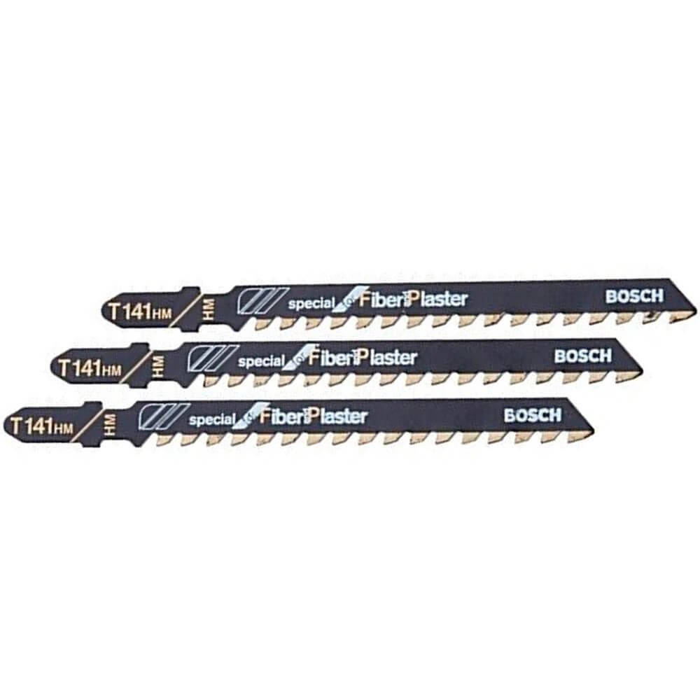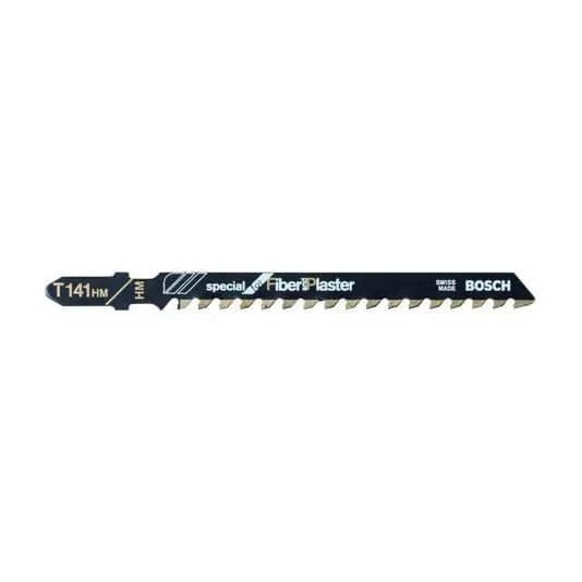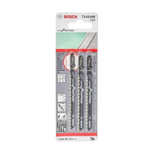A lâmina de serra tico tico T141HM Special for Fibre and Plaster é muito resistente ao fazer cortes retos limpos em materiais especiais grossos e finos. Os seus dentes laterais de carbeto de tungstênio foram feitos para uso prolongado em materiais à base de minerais muito abrasivos. Além disso, cada dente é soldado ao corpo de aço de carbono (HCS) muito elástico com a tecnologia Bosch, permitindo que a lâmina corte materiais abrasivos muito resistentes, como placa de fibra de cimento, placas de gesso, betão celular e plástico reforçado a fibra de vidro. Está equipada com um passo dos dentes grande (4,3 mm) e comprimento de 100 mm para cortar materiais de fibra e gesso com 5-50 mm de espessura. Para utilizar com serras tico tico compatíveis com encaixe em T.