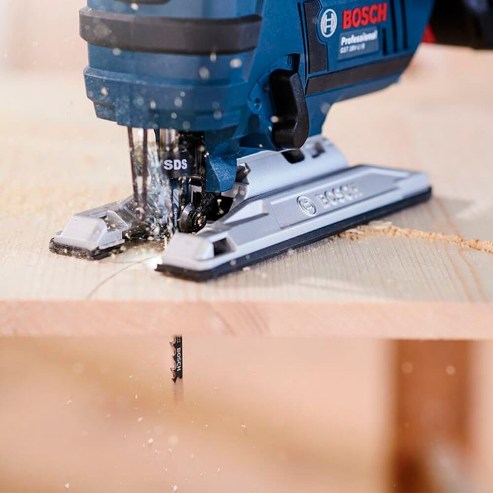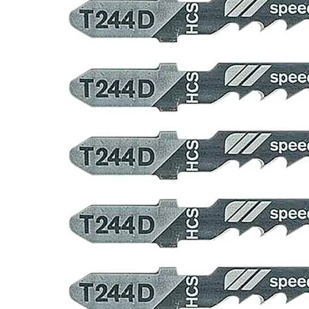 A lâmina de serra tico tico T244D Speed for Wood faz cortes curvos rápidos na madeira. Os seus dentes laterais afiados efetuam cortes rápidos e a largura da sua lâmina estreita está otimizada para cortes curvos. A lâmina em aço carbono (HCS) é ideal para madeira macia e materiais de madeira não abrasivos. Além disso, o seu passo dos dentes progressivo fino permite que a lâmina corte uma variedade de materiais em madeira com 5-50 mm de espessura. Para utilizar com serras tico tico compatíveis com encaixe em T.