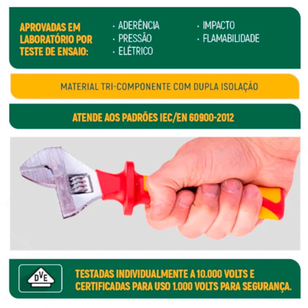Com garantia de certificação IEC 60900 oferece ao usuário a mais alta proteção quando utilizadas em trabalhos de alta voltagem. Elevamos o nível de proteção elétrica ao máximo, para profissionais dos mais variados seguimentos terem segurança garantida para executarem suas tarefas com tranquilidade. Além de garantir a segurança do usuário, facilitam o uso durante a manutenção e instalação elétrica, uma vez que possuem design ergonômico e são especialmente desenvolvidas para o uso profissional.