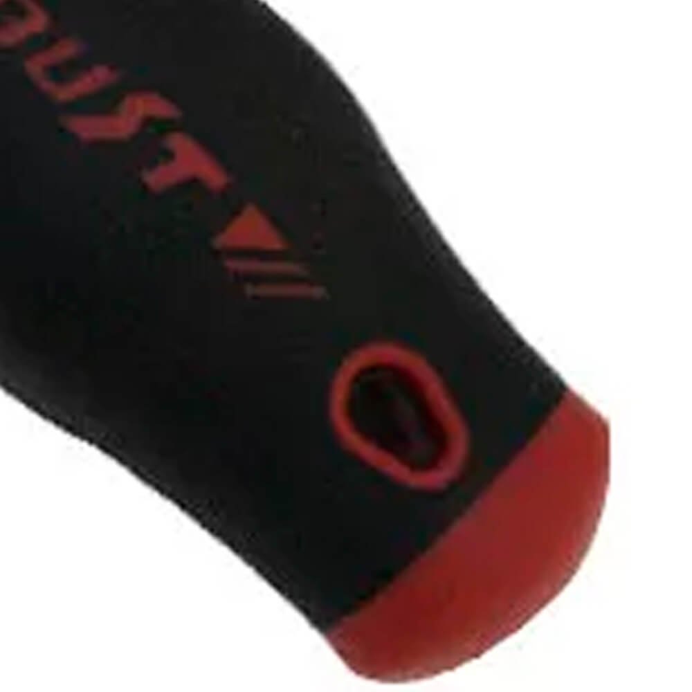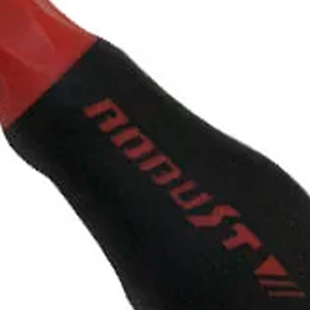 Com cabo emborrachado da cor preta , com detalhes vermelhos; Garante melhor manuseio da ferramenta;