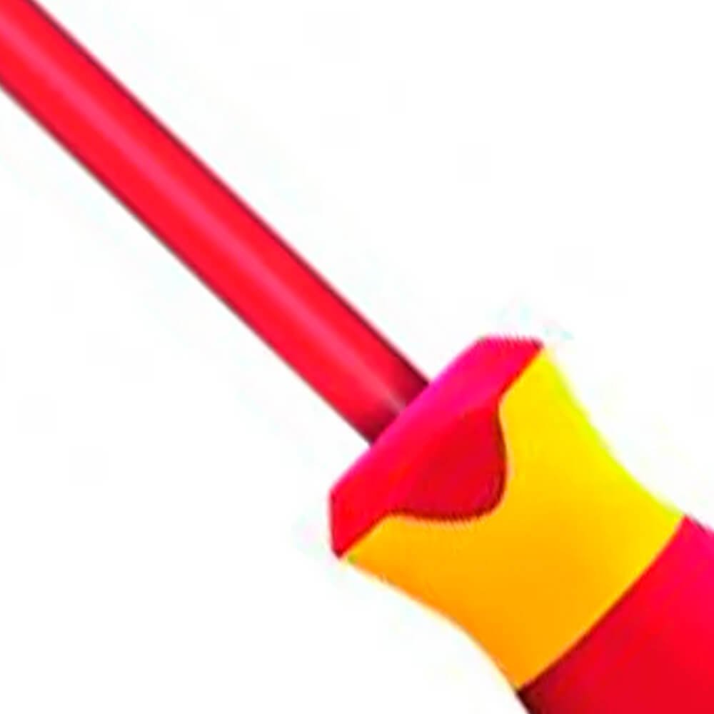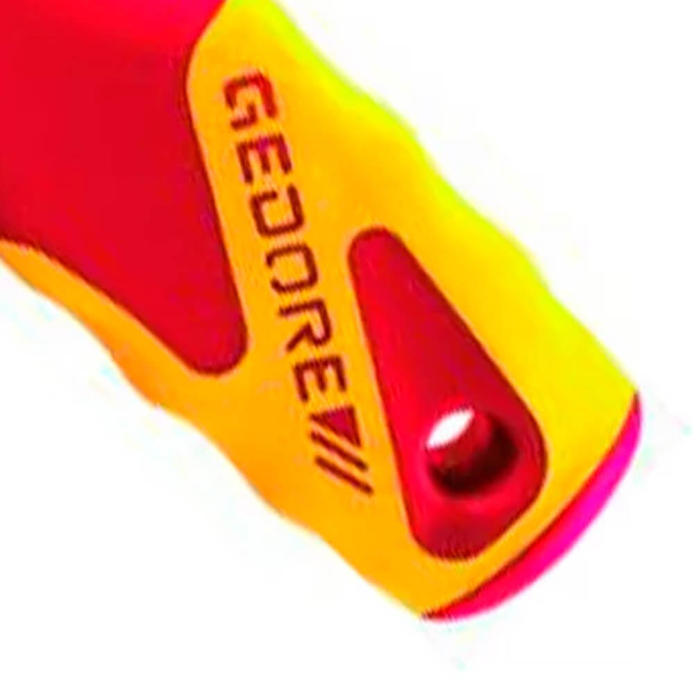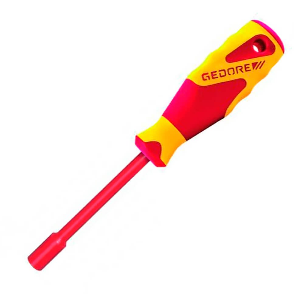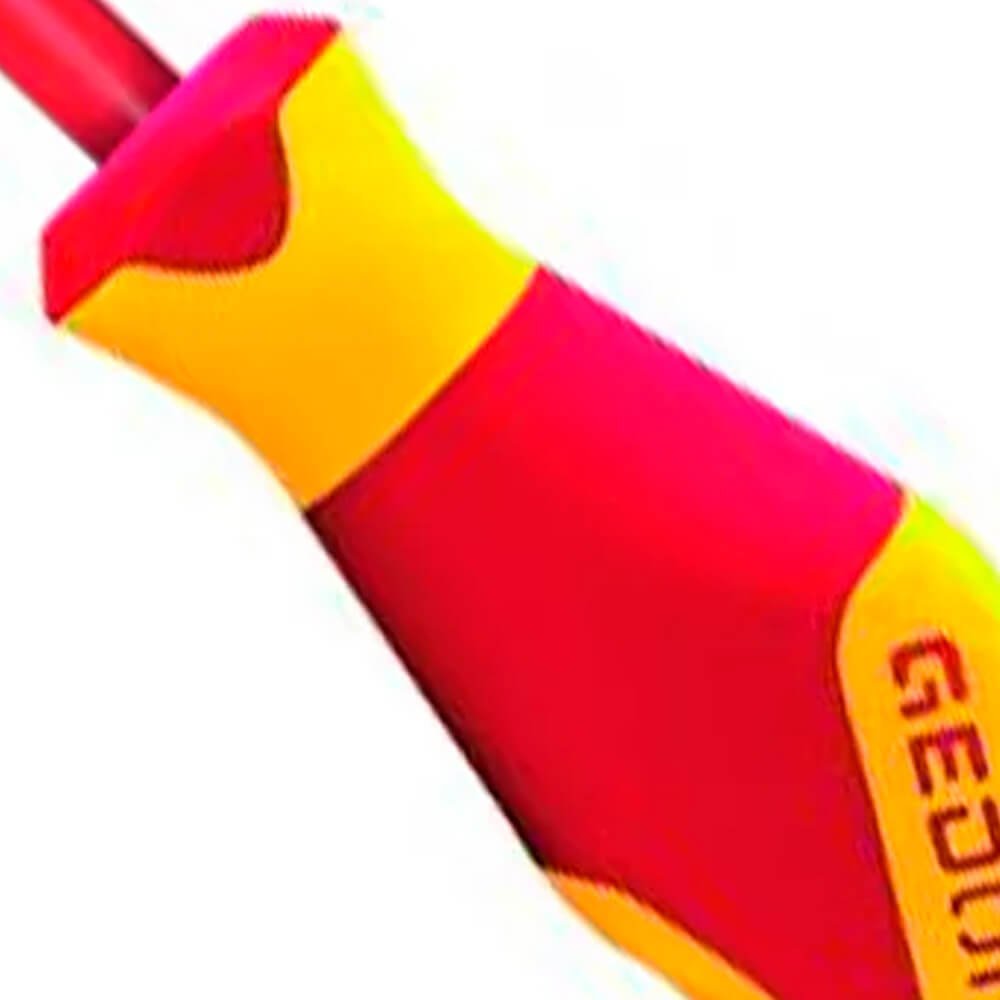 Aço especial e polímero anti-chamas, nas cores vermelho e amarelo, padrão Gedore. Haste com acabamento escurecido. Com revestimento produzido por injeção, propiciando isolação até 1000 V, conforme norma EN 60900 / IEC 60900, submetida à ensaio de: impacto, tensão elétrica, aderência, inflamabilidade e pressão/penetração. Utilizar ferramentas isoladas VDE, em tensão máxima de 1000 V em corrente alternada e 1500 V em corrente contínua, conforme norma EN 60900 / IEC 60900. Atende com segurança a norma regulamentadora NR 10 - Segurança em Instalações e Serviços em Eletricidade, possui certificado de isolação. Empunhadura ergonômica em 3 componentes Power-Grip 3, que permite ao operador a execução do trabalho preciso e sem fadiga, devido ao ajuste positivo da empunhadura e encaixe para transmissão de força adequada. Profundidade interna: 25 mm. Chave com perfil de encaixe para parafuso com sextavado externo.
