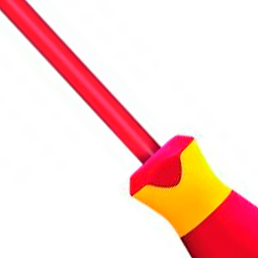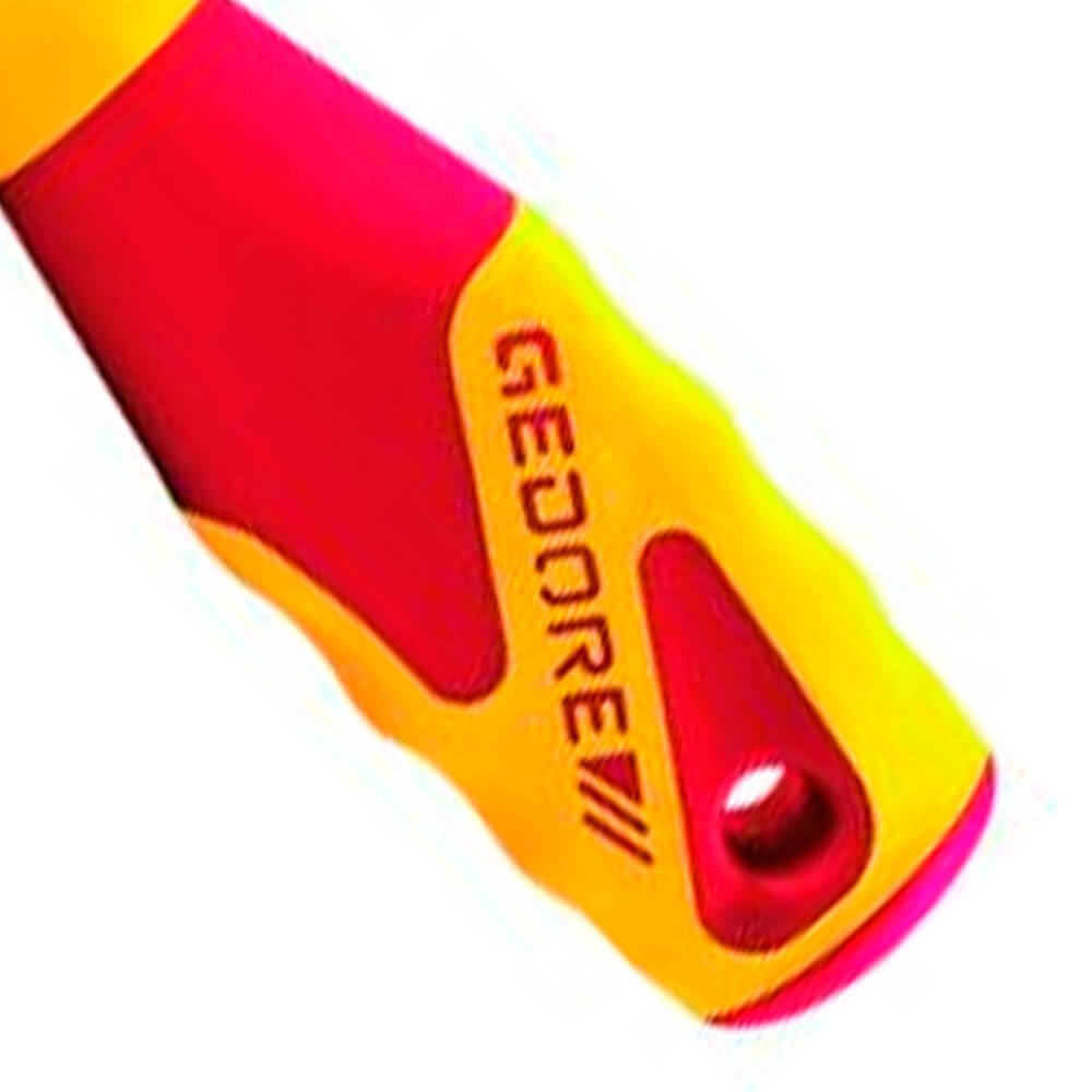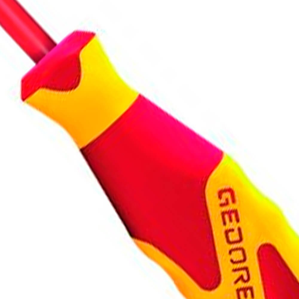 Aço especial e polímero anti-chamas, nas cores vermelho e amarelo, padrão Gedore. Haste com acabamento escurecido. Com revestimento produzido por injeção, propiciando isolação até 1000 V, conforme norma EN 60900 / IEC 60900, submetida à ensaio de: impacto, tensão elétrica, aderência, inflamabilidade e pressão/penetração. Utilizar ferramentas isoladas VDE, em tensão máxima de 1000 V em corrente alternada e 1500 V em corrente contínua, conforme norma EN 60900 / IEC 60900. Atende com segurança a norma regulamentadora NR 10 - Segurança em Instalações e Serviços em Eletricidade, possui certificado de isolação. Empunhadura ergonômica em 3 componentes Power-Grip 3, que permite ao operador a execução do trabalho preciso e sem fadiga, devido ao ajuste positivo da empunhadura e encaixe para transmissão de força adequada. Profundidade interna: 25 mm. Chave com perfil de encaixe para parafuso com sextavado externo.