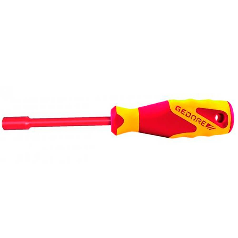 Aço especial e polímero anti-chamas, nas cores vermelho e amarelo, padrão Gedore. Haste com acabamento escurecido. Com revestimento produzido por injeção, propiciando isolação até 1000 V, conforme norma EN 60900 / IEC 60900, submetida à ensaio de: impacto, tensão elétrica, aderência, inflamabilidade e pressão/penetração. Utilizar ferramentas isoladas VDE, em tensão máxima de 1000 V em corrente alternada e 1500 V em corrente contínua, conforme norma EN 60900 / IEC 60900. Utilizada para apertar e soltar parafusos sextavados, porcas sextavadas ou quadradas por profissionais que trabalham em áreas de risco (redes energizadas e instalações industriais);