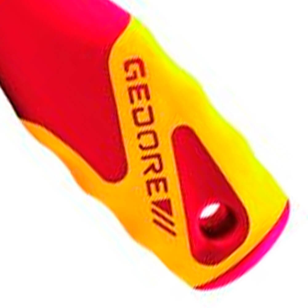 Aço especial e polímero anti-chamas, nas cores vermelho e amarelo, padrão Gedore. Haste com acabamento escurecido. Com revestimento produzido por injeção, propiciando isolação até 1000 V, conforme norma EN 60900 / IEC 60900, submetida à ensaio de: impacto, tensão elétrica, aderência, inflamabilidade e pressão/penetração. Utilizar ferramentas isoladas VDE, em tensão máxima de 1000 V em corrente alternada e 1500 V em corrente contínua, conforme norma EN 60900 / IEC 60900. Atende com segurança a norma regulamentadora NR 10 - Segurança em Instalações e Serviços em Eletricidade, possui certificado de isolação. Empunhadura ergonômica em 3 componentes Power-Grip 3, que permite ao operador a execução do trabalho preciso e sem fadiga, devido ao ajuste positivo da empunhadura e encaixe para transmissão de força adequada. Profundidade interna: 25 mm. Chave com perfil de encaixe para parafuso com sextavado externo.