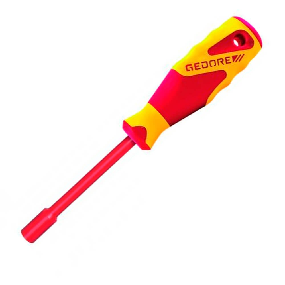 Aço especial e polímero anti-chamas, nas cores vermelho e amarelo, padrão Gedore. Haste com acabamento escurecido. Com revestimento produzido por injeção, propiciando isolação até 1000 V, conforme norma EN 60900 / IEC 60900, submetida à ensaio de: impacto, tensão elétrica, aderência, inflamabilidade e pressão/penetração. Utilizar ferramentas isoladas VDE, em tensão máxima de 1000 V em corrente alternada e 1500 V em corrente contínua, conforme norma EN 60900 / IEC 60900. Utilizada para apertar e soltar parafusos sextavados, porcas sextavadas ou quadradas por profissionais que trabalham em áreas de risco (redes energizadas e instalações industriais);