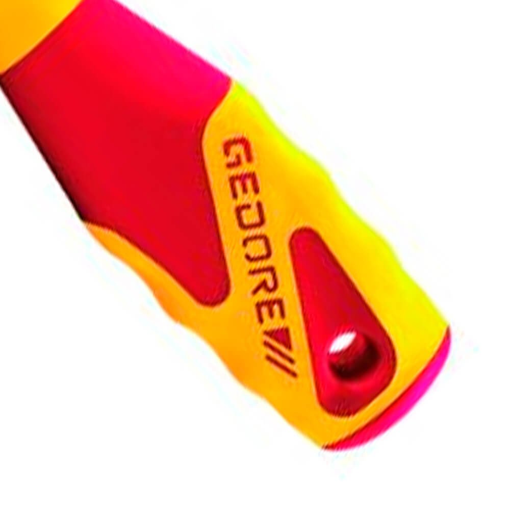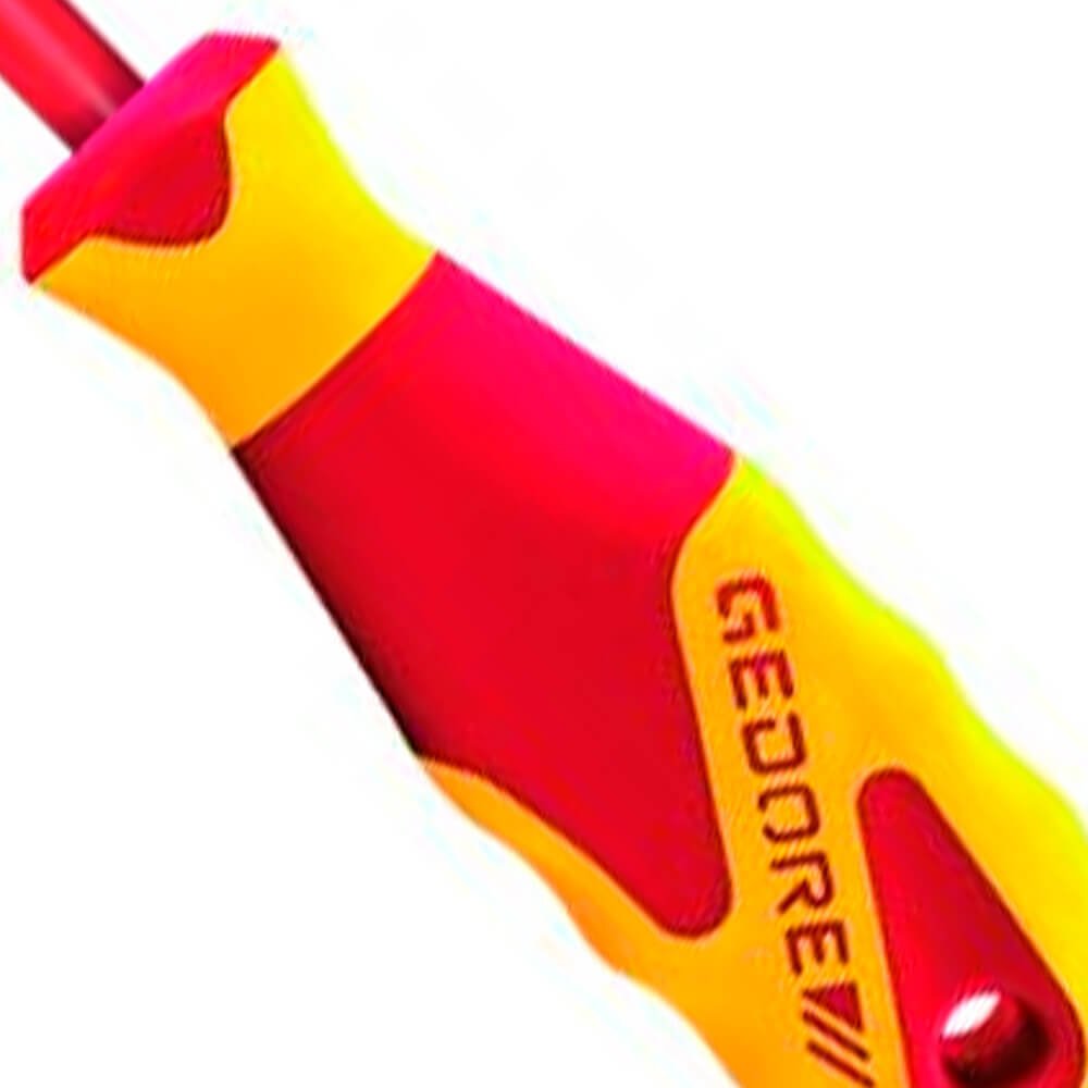Aço especial e polímero anti-chamas, nas cores vermelho e amarelo, padrão Gedore. Haste com acabamento escurecido. Com revestimento produzido por injeção, propiciando isolação até 1000 V, conforme norma EN 60900 / IEC 60900, submetida à ensaio de: impacto, tensão elétrica, aderência, inflamabilidade e pressão/penetração. Utilizar ferramentas isoladas VDE, em tensão máxima de 1000 V em corrente alternada e 1500 V em corrente contínua, conforme norma EN 60900 / IEC 60900. Atende com segurança a norma regulamentadora NR 10 - Segurança em Instalações e Serviços em Eletricidade, possui certificado de isolação. Empunhadura ergonômica em 3 componentes Power-Grip 3, que permite ao operador a execução do trabalho preciso e sem fadiga, devido ao ajuste positivo da empunhadura e encaixe para transmissão de força adequada. Profundidade interna: 25 mm. Chave com perfil de encaixe para parafuso com sextavado externo.