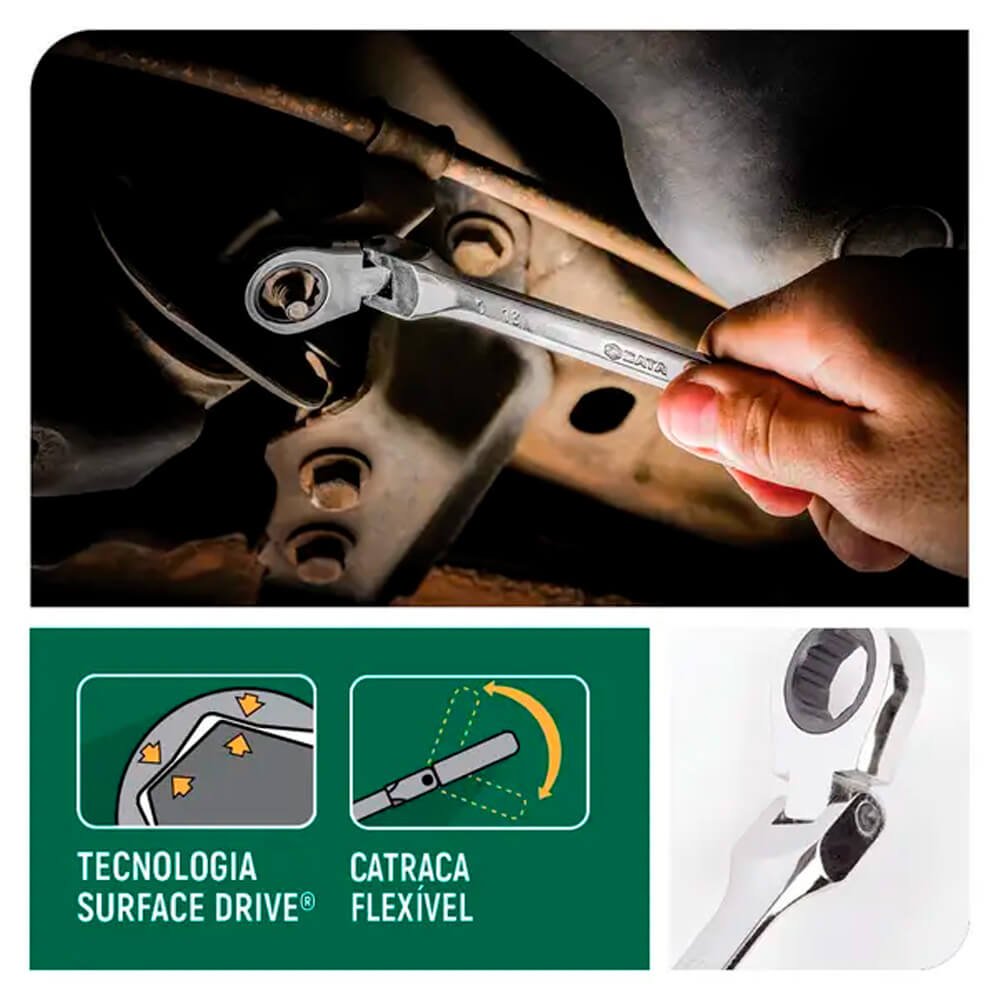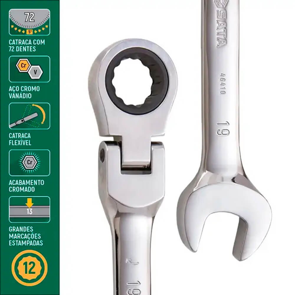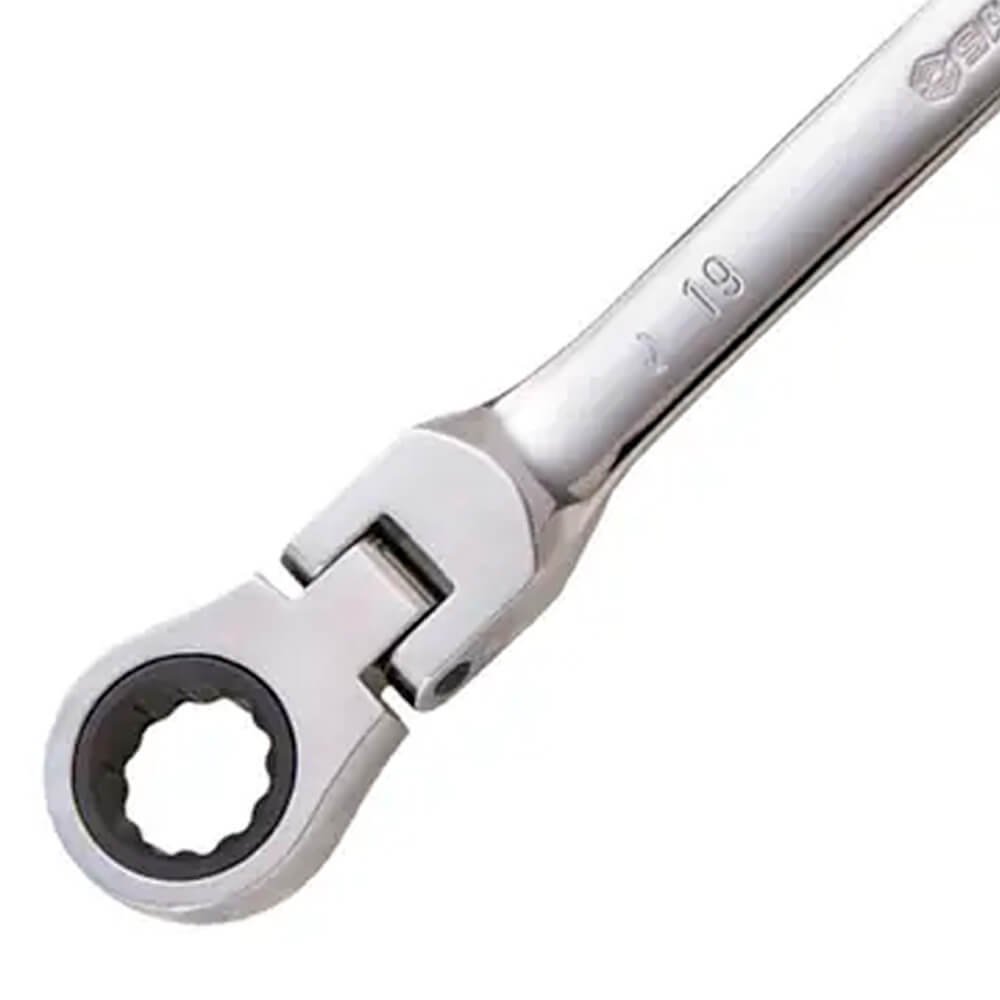Chave combinada catraca cabeça flexível de com 180º de movimento indicada para trabalho em locais de difícil acesso e que possam ser alcançados apenas flexionando a cabeça da chave. Perfeita para profissionais mecanicos realizarem trabalhos em áreas de difícil acesso com sua extremidade móvel, inclusive com apertos finais mesmo quando a cabeça do parafuso estiver paralela ao corpo da chave. Sua cabeça flexível permite alcançar diferentes ângulos combinada com sua catraca permite realizar trabalhos em pequenos espaços. Tornando o trabalho muito mais ágil e versátil, para realizar ajustes, regulagens e apertos de porcas ou parafusos, de perfil sextavado ou quadrado.
