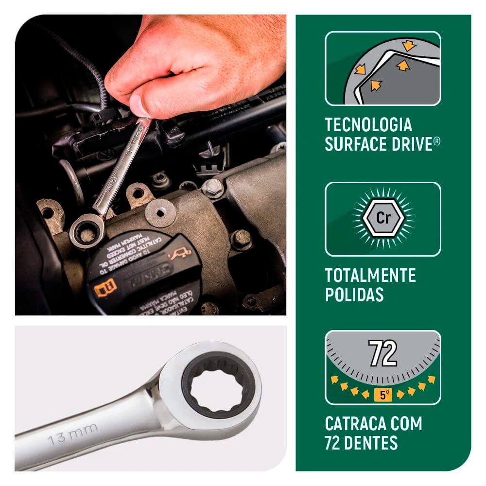 Chave combinada catraca cabeça flexível de com 180º de movimento indicada para trabalho em locais de difícil acesso e que possam ser alcançados apenas flexionando a cabeça da chave. Perfeita para profissionais mecanicos realizarem trabalhos em áreas de difícil acesso com sua extremidade móvel, inclusive com apertos finais mesmo quando a cabeça do parafuso estiver paralela ao corpo da chave. Sua cabeça flexível permite alcançar diferentes ângulos combinada com sua catraca permite realizar trabalhos em pequenos espaços. Tornando o trabalho muito mais ágil e versátil, para realizar ajustes, regulagens e apertos de porcas ou parafusos, de perfil sextavado ou quadrado.