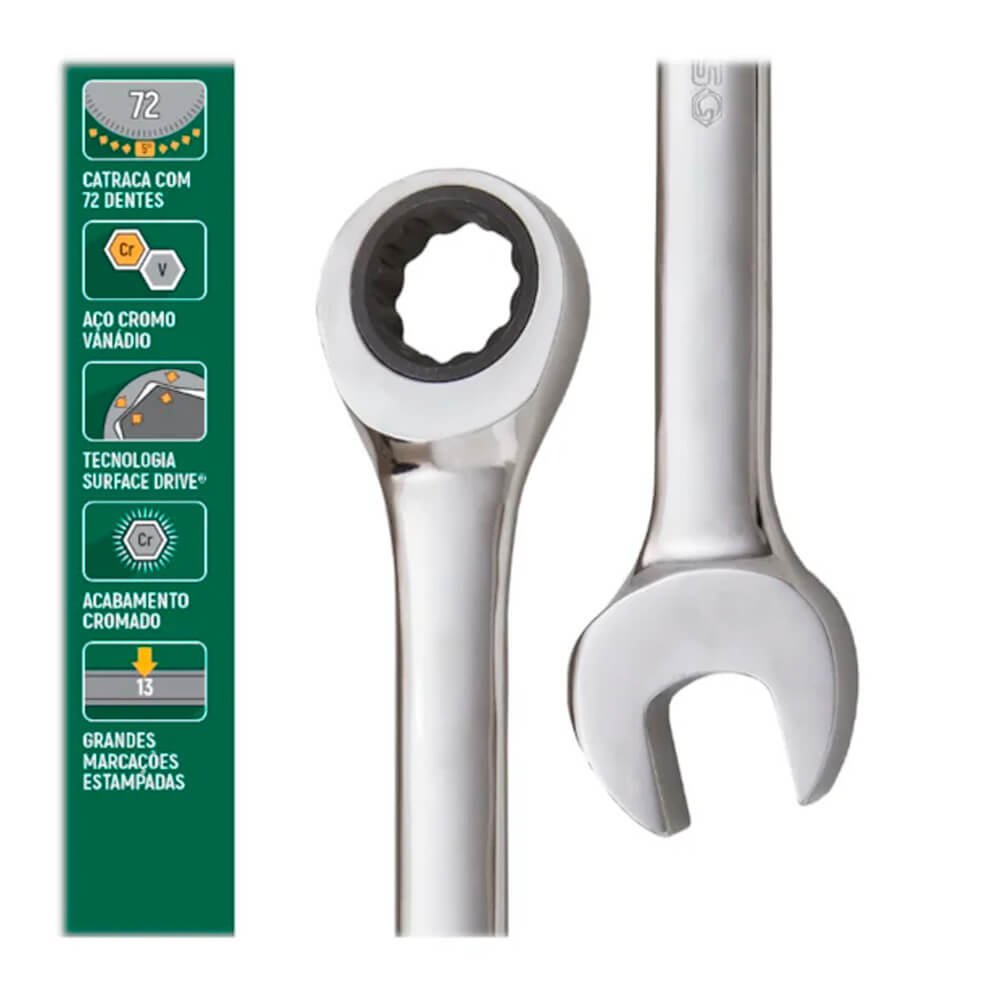 Chave combinada com catraca de qualidade profissional superior possuí 72 posições proporcionando um arco de giro de apenas 5° ideal para espaços de dificil alcance ou apertados. Chave duas em uma possuí chave de boca de um lado e uma chave estrela com catraca do outro com tecnologia surface drive, para abraçar o parafuso ou a porca com mais segurança e facilitar pra você apertar ou desapertar eles sem muito esforço, mesmo em situações complicadas. Garantia Garantia Vitalícia SATA