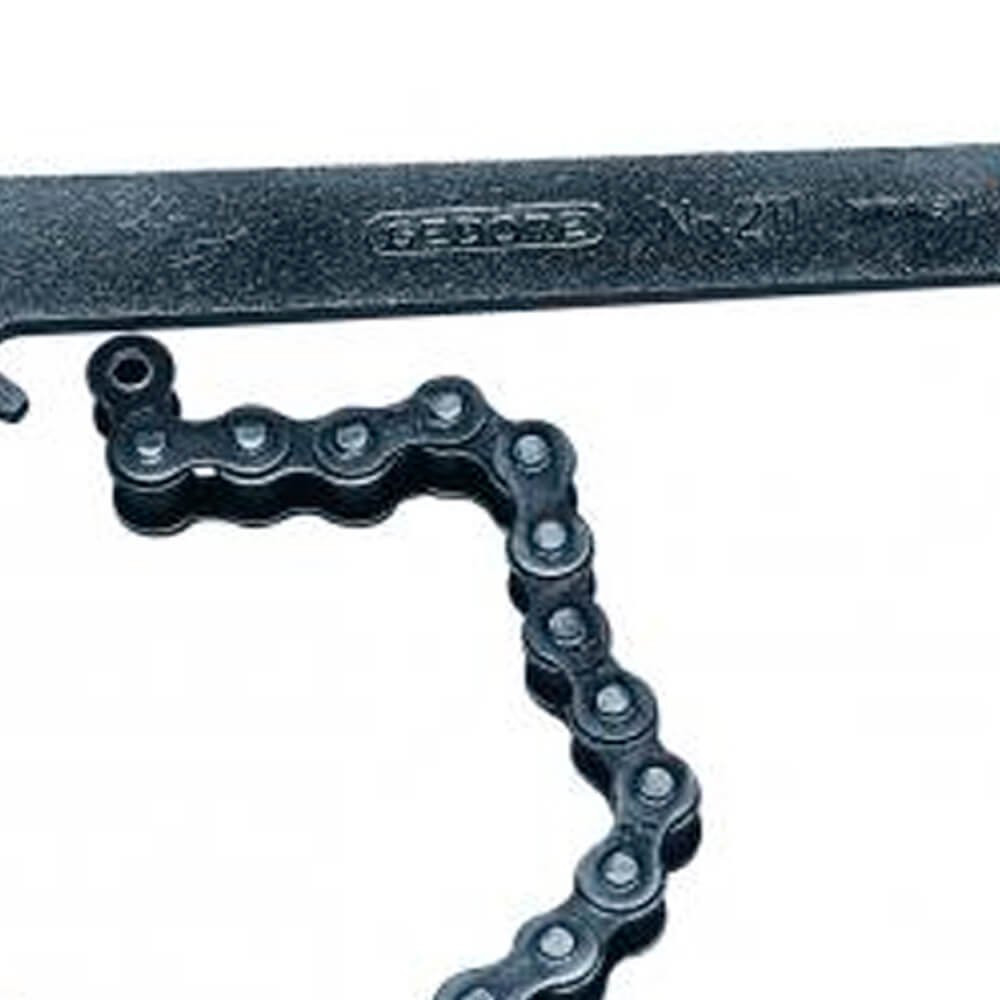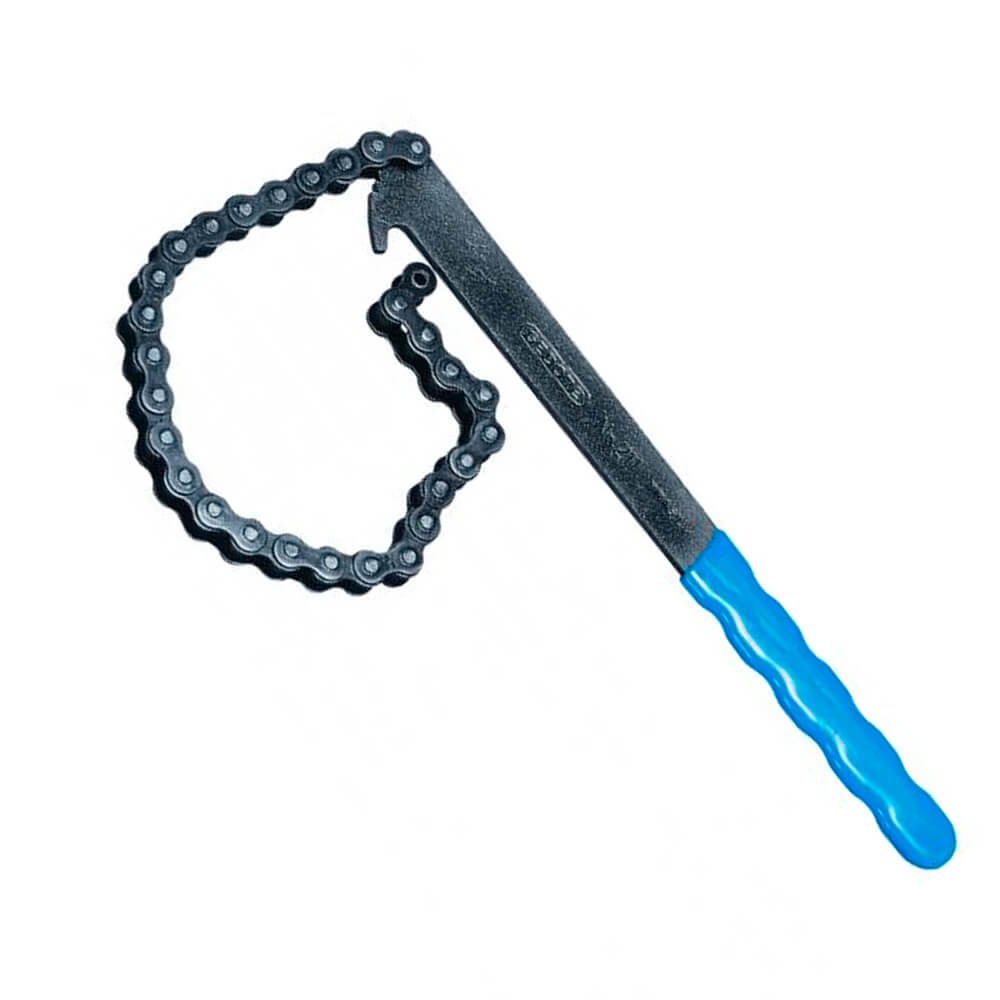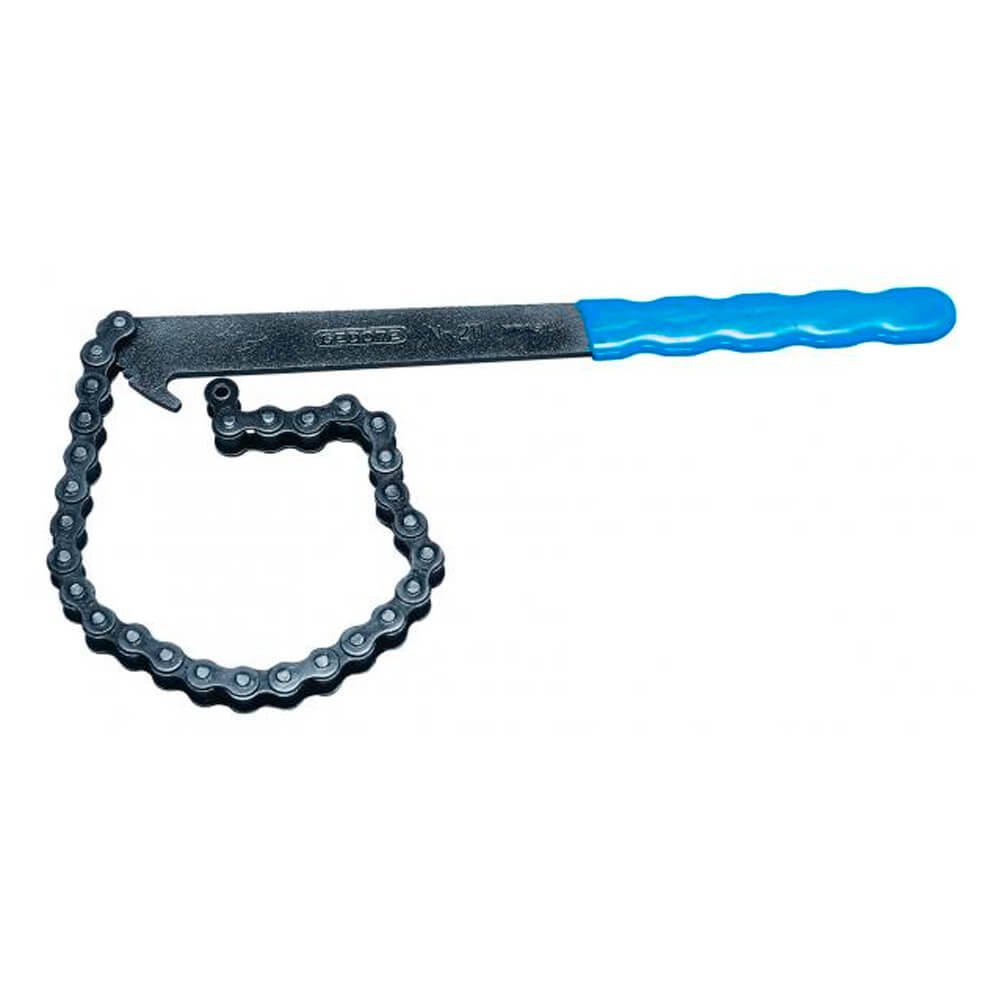 Corpo e corrente em aço especial, empunhadura plasticada na cor azul padrão Gedore. Acabamento escurecido. Indicada para utilização em tubulações e filtro de óleo.