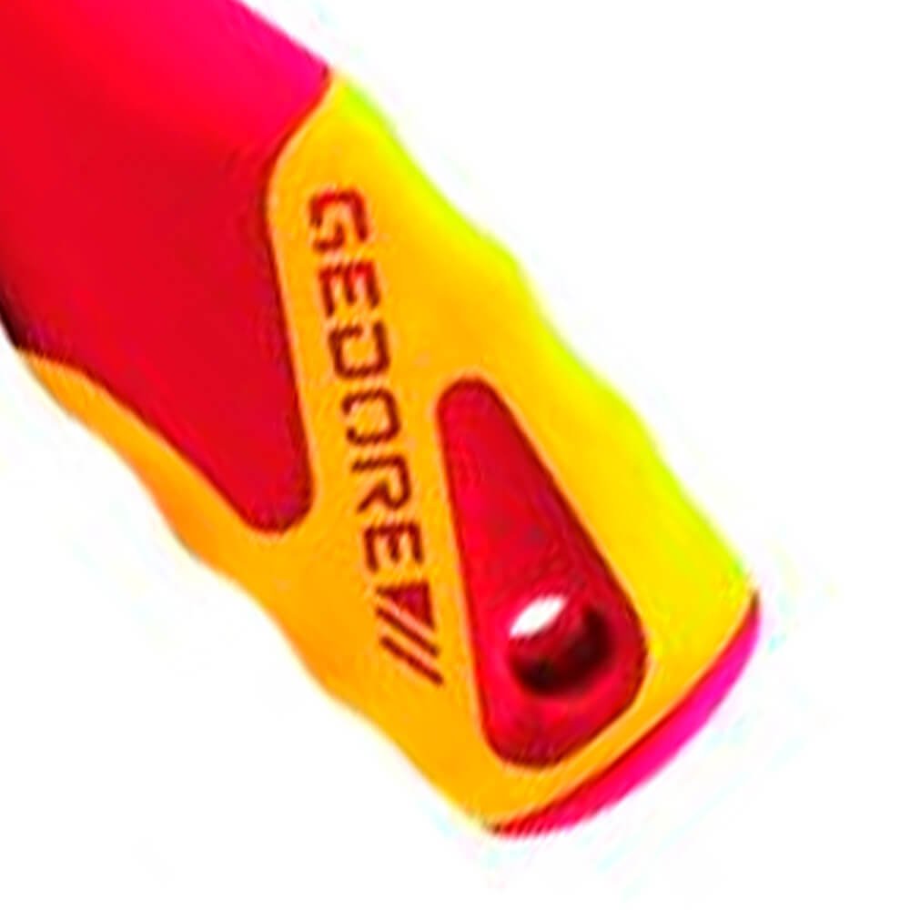Aço Molibdênio-Vanadium-Plus e polímero anti-chamas, nas cores vermelho e amarelo, padrão Gedore. Acabamento escurecido. Com revestimento produzido por injeção, propiciando isolação até 1000 V, conforme norma EN 60900 / IEC 60900, submetida à ensaios de: impacto, tensão elétrica, aderência, inflamabilidade e pressão/penetração. Utilizar ferramentas isoladas VDE, em tensão máxima de 1000 V em corrente alternada e 1500 V em corrente contínua, conforme norma EN 60900 / IEC 60900. Atende com segurança a norma regulamentadora NR 10 - Segurança em Instalações e Serviços em Eletricidade, possui certificado de isolação. Empunhadura ergonômica em 3 componentes Power-Grip 3, que permite ao operador a execução do trabalho preciso e sem fadiga, devido ao ajuste positivo da empunhadura e lâmina para transmissão de força adequada. Encaixe identificado no final da empunhadura. Chave com haste redonda e resistente, com perfil de encaixe para parafusos tipo fenda cruzada “Phillips".
