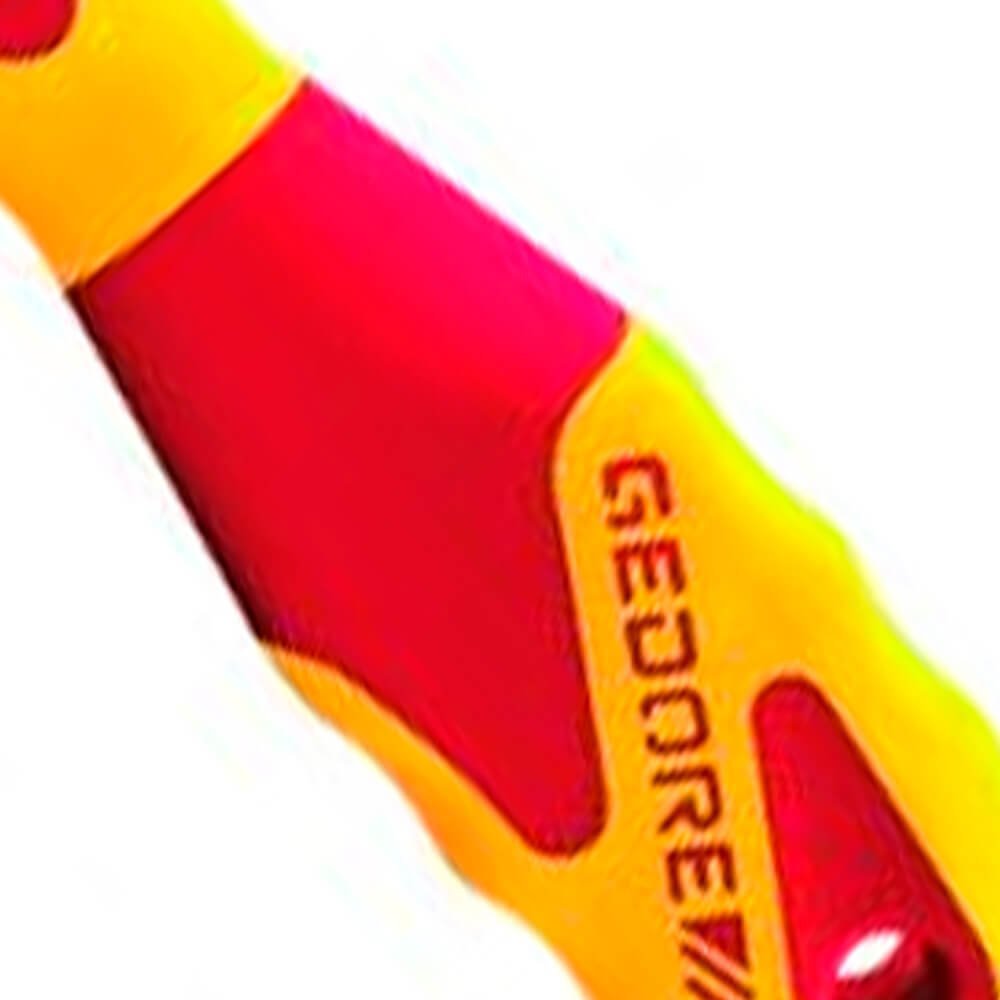 Aço Molibdênio-Vanadium-Plus e polímero anti-chamas, nas cores vermelho e amarelo, padrão Gedore. Acabamento escurecido. Com revestimento produzido por injeção, propiciando isolação até 1000 V, conforme norma EN 60900 / IEC 60900, submetida à ensaios de: impacto, tensão elétrica, aderência, inflamabilidade e pressão/penetração. Utilizar ferramentas isoladas VDE, em tensão máxima de 1000 V em corrente alternada e 1500 V em corrente contínua, conforme norma EN 60900 / IEC 60900. Atende com segurança a norma regulamentadora NR 10 - Segurança em Instalações e Serviços em Eletricidade, possui certificado de isolação. Empunhadura ergonômica em 3 componentes Power-Grip 3, que permite ao operador a execução do trabalho preciso e sem fadiga, devido ao ajuste positivo da empunhadura e lâmina para transmissão de força adequada. Encaixe identificado no final da empunhadura. Chave com haste redonda e resistente, com perfil de encaixe para parafusos tipo fenda cruzada “Phillips".