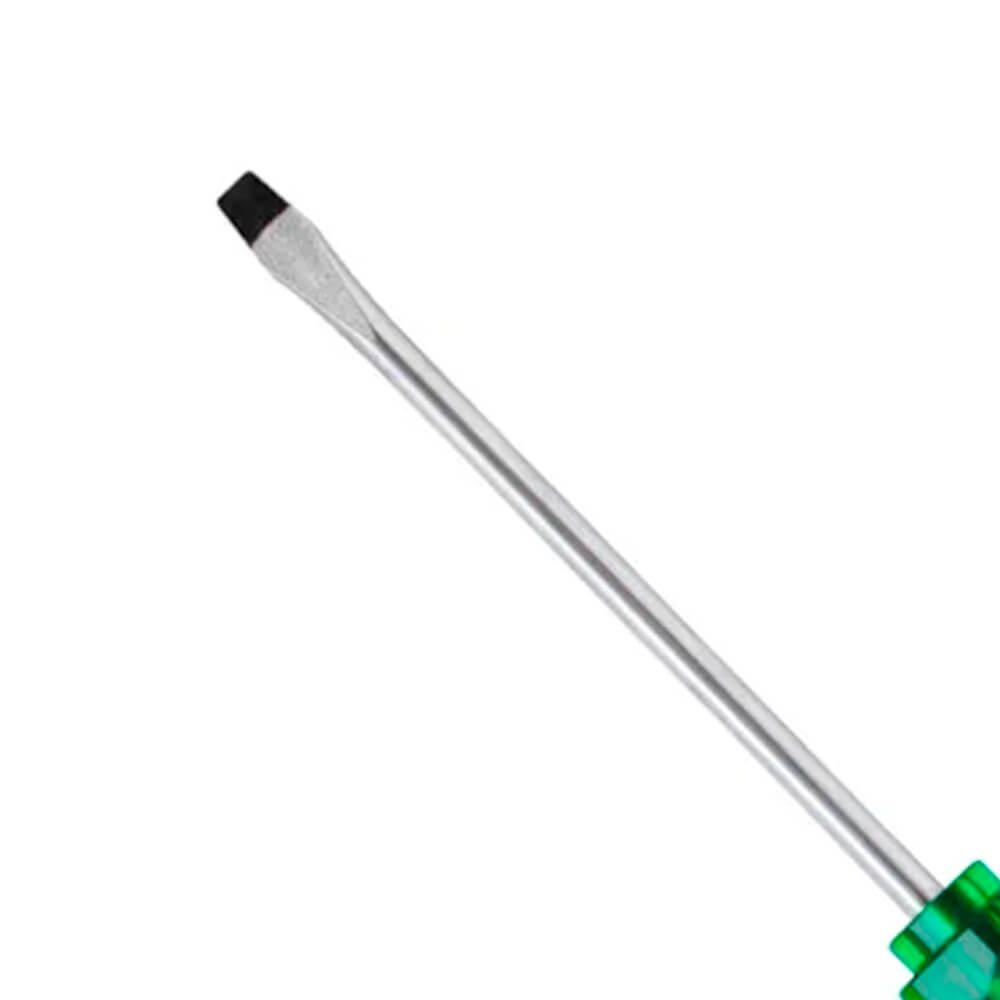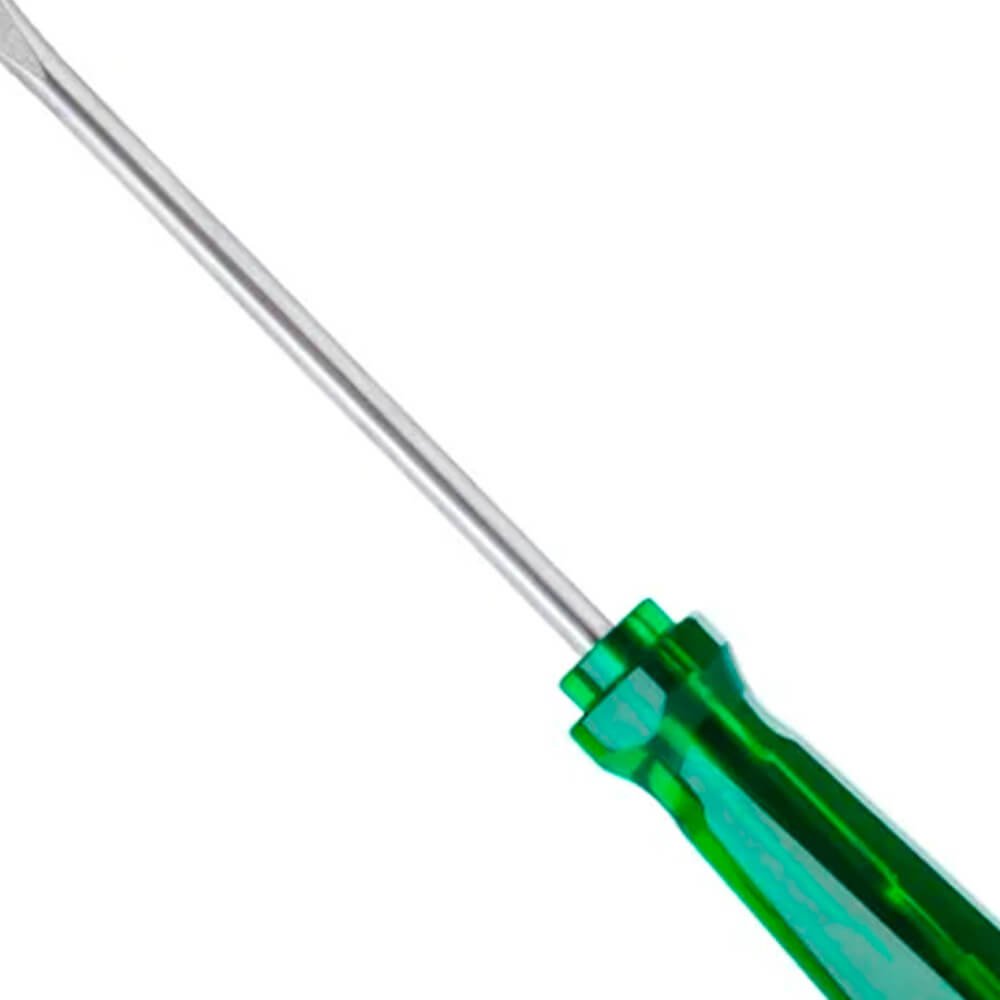 Chave De Fenda com cabo PVC translucido verde ergonômico com ponta oxidada para evitar descascamento e proporcionar mais segurança. Possui a haste toda temperada com acabamento niquelado e cromado. Ideal para uso profissional pesado, seu cabo ergonômico rígido e resistente injetado em PVC na cor verde transparente deixa aparente a profundidade que a haste está garantindo máxima qualidade e resistência para o trabalho diário.