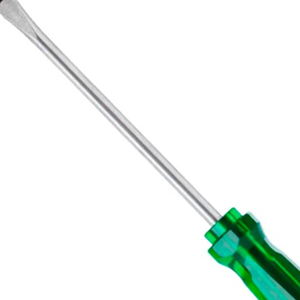 Chave De Fenda com cabo PVC translucido verde ergonômico com ponta oxidada para evitar descascamento e proporcionar mais segurança. Possui a haste toda temperada com acabamento niquelado e cromado. Ideal para uso profissional pesado, seu cabo ergonômico rígido e resistente injetado em PVC na cor verde transparente deixa aparente a profundidade que a haste está garantindo máxima qualidade e resistência para o trabalho diário.