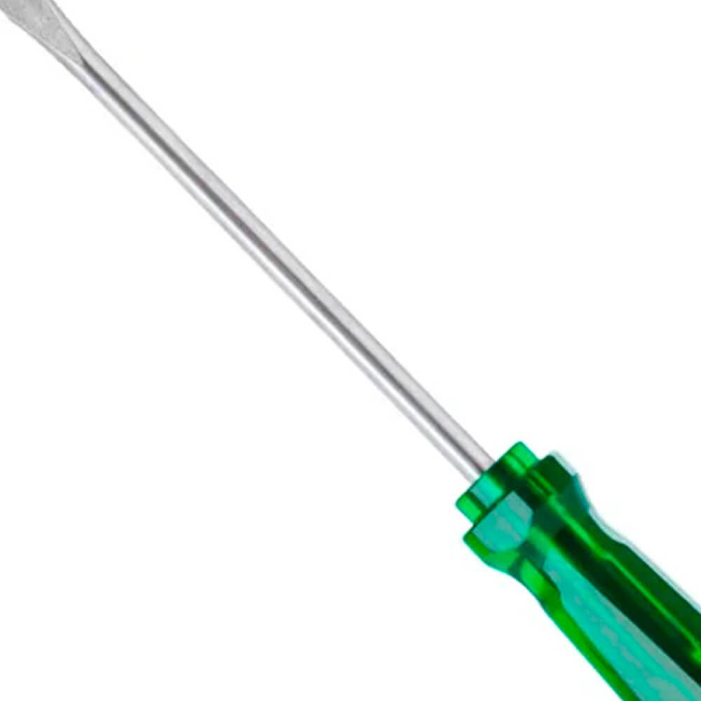 Chave De Fenda com cabo PVC translucido verde ergonômico com ponta oxidada para evitar descascamento e proporcionar mais segurança. Possui a haste toda temperada com acabamento niquelado e cromado. Ideal para uso profissional pesado, seu cabo ergonômico rígido e resistente injetado em PVC na cor verde transparente deixa aparente a profundidade que a haste está garantindo máxima qualidade e resistência para o trabalho diário.