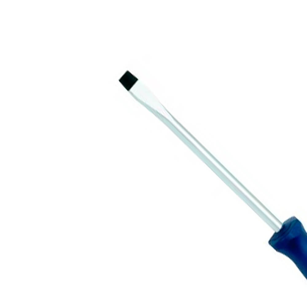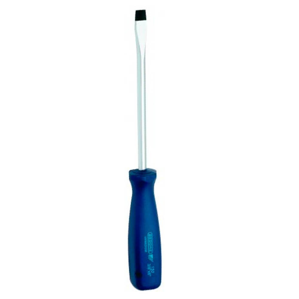 Haste em aço Gedore-Vanadium e cabo em polímero na cor azul padrão Gedore. Haste com acabamento niquelado e cromado, com ponta escurecida. Cabo ergonômico. Chave com haste redonda e resistente, com perfil de encaixe para parafuso tipo fenda simples.