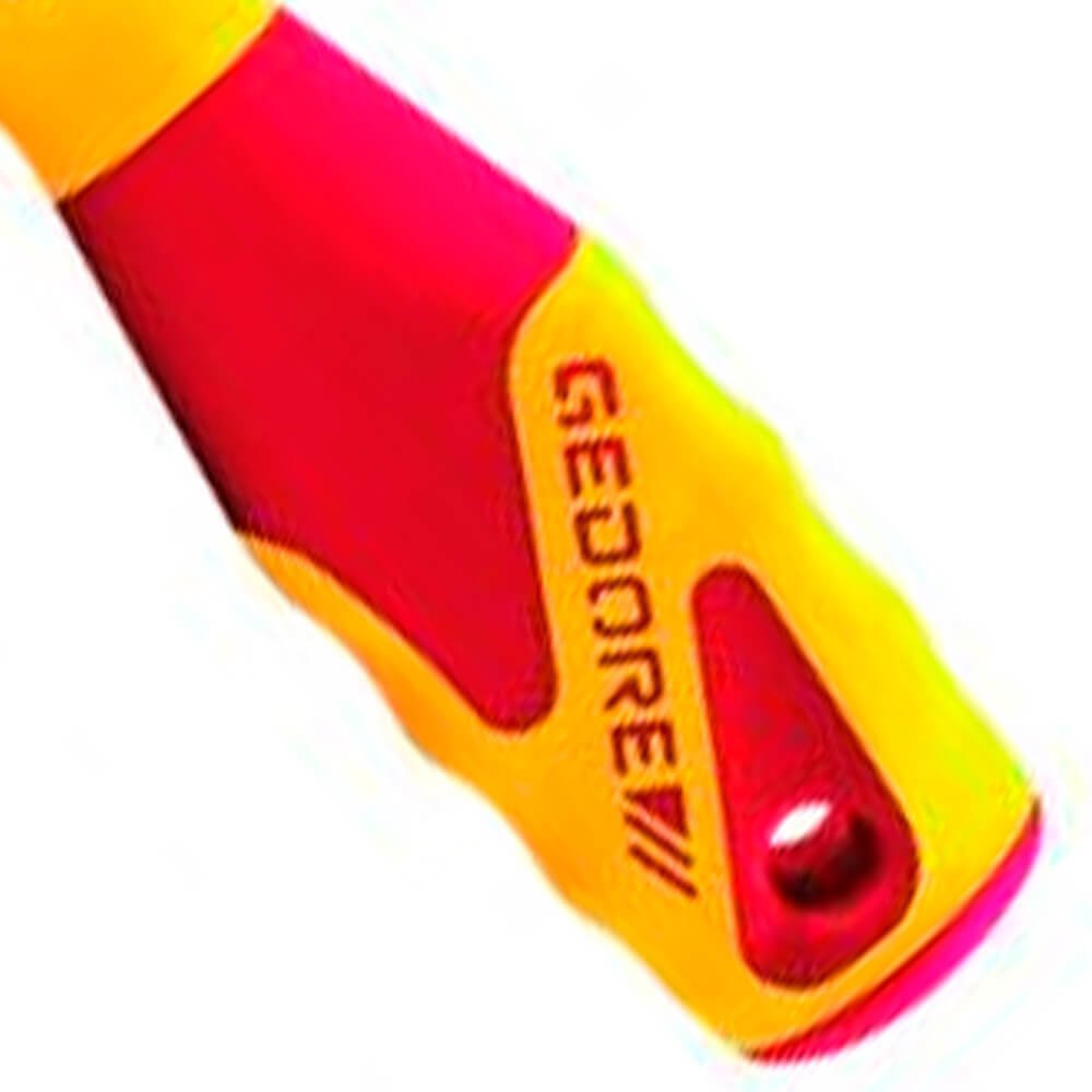Aço Molibdênio-Vanadium-Plus e polímero anti-chamas, nas cores vermelho e amarelo, padrão Gedore. Haste com acabamento escurecido. Com revestimento produzido por injeção, propiciando isolação até 1000 V, conforme norma EN 60900 / IEC 60900, submetida à ensaios de: impacto, tensão elétrica, aderência, inflamabilidade, pressão/penetração. Utilizar ferramentas isoladas VDE, em tensão máxima de 1000 V em corrente alternada e 1500 V em corrente contínua, conforme norma EN 60900 / IEC 60900. Atende com segurança a norma regulamentadora NR 10 - Segurança em Instalações e Serviços em Eletricidade, possui certificado de isolação. Empunhadura ergonômica em 3 componentes Power-Grip 3, que permite ao operador a execução do trabalho preciso e sem fadiga, devido ao ajuste positivo da empunhadura e lâmina para transmissão de força adequada. Encaixe identificado no final da empunhadura. Chave com haste redonda e resistente, com perfil de encaixe para parafuso tipo fenda simples.