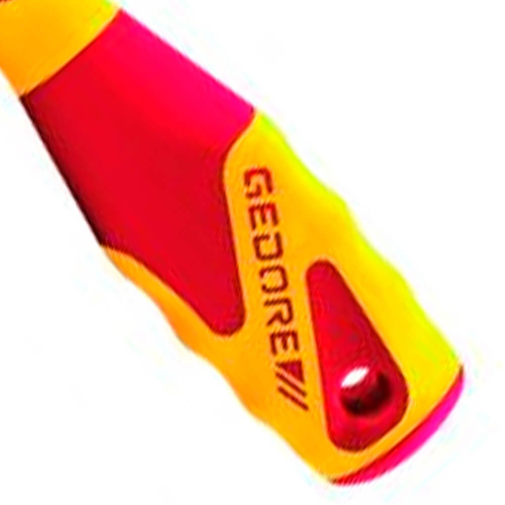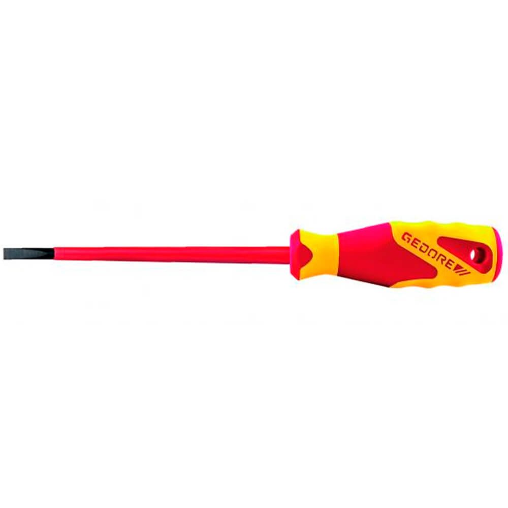 Aço Molibdênio-Vanadium-Plus e polímero anti-chamas, nas cores vermelho e amarelo, padrão Gedore. Haste com acabamento escurecido. Com revestimento produzido por injeção, propiciando isolação até 1000 V, conforme norma EN 60900 / IEC 60900, submetida à ensaios de: impacto, tensão elétrica, aderência, inflamabilidade, pressão/penetração. Utilizar ferramentas isoladas VDE, em tensão máxima de 1000 V em corrente alternada e 1500 V em corrente contínua, conforme norma EN 60900 / IEC 60900. Atende com segurança a norma regulamentadora NR 10 - Segurança em Instalações e Serviços em Eletricidade, possui certificado de isolação. Empunhadura ergonômica em 3 componentes Power-Grip 3, que permite ao operador a execução do trabalho preciso e sem fadiga, devido ao ajuste positivo da empunhadura e lâmina para transmissão de força adequada. Encaixe identificado no final da empunhadura. Chave com haste redonda e resistente, com perfil de encaixe para parafuso tipo fenda simples.