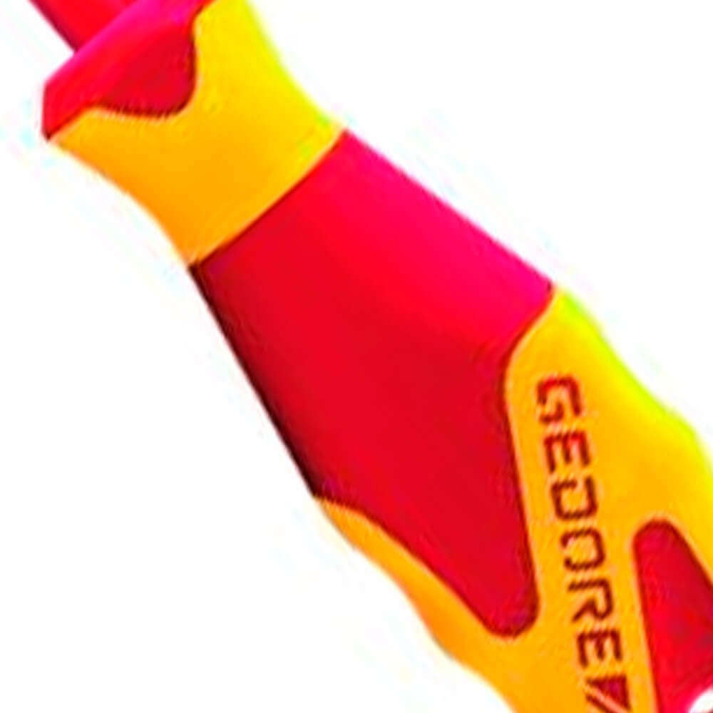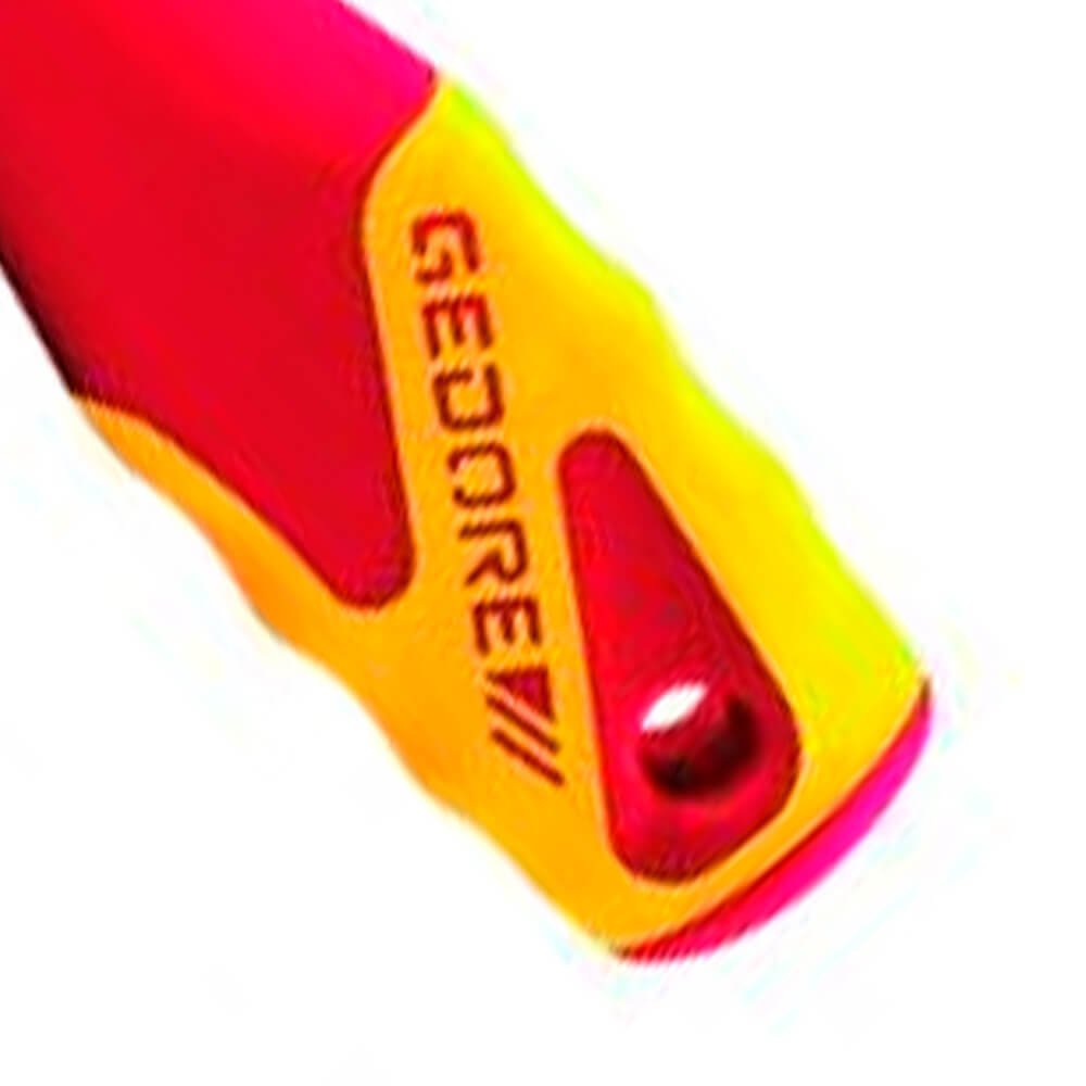 Aço Molibdênio-Vanadium-Plus e polímero anti-chamas, nas cores vermelho e amarelo, padrão Gedore. Haste com acabamento escurecido. Com revestimento produzido por injeção, propiciando isolação até 1000 V, conforme norma EN 60900 / IEC 60900, submetida à ensaios de: impacto, tensão elétrica, aderência, inflamabilidade, pressão/penetração. Utilizar ferramentas isoladas VDE, em tensão máxima de 1000 V em corrente alternada e 1500 V em corrente contínua, conforme norma EN 60900 / IEC 60900. Atende com segurança a norma regulamentadora NR 10 - Segurança em Instalações e Serviços em Eletricidade, possui certificado de isolação. Empunhadura ergonômica em 3 componentes Power-Grip 3, que permite ao operador a execução do trabalho preciso e sem fadiga, devido ao ajuste positivo da empunhadura e lâmina para transmissão de força adequada. Encaixe identificado no final da empunhadura. Chave com haste redonda e resistente, com perfil de encaixe para parafuso tipo fenda simples.
