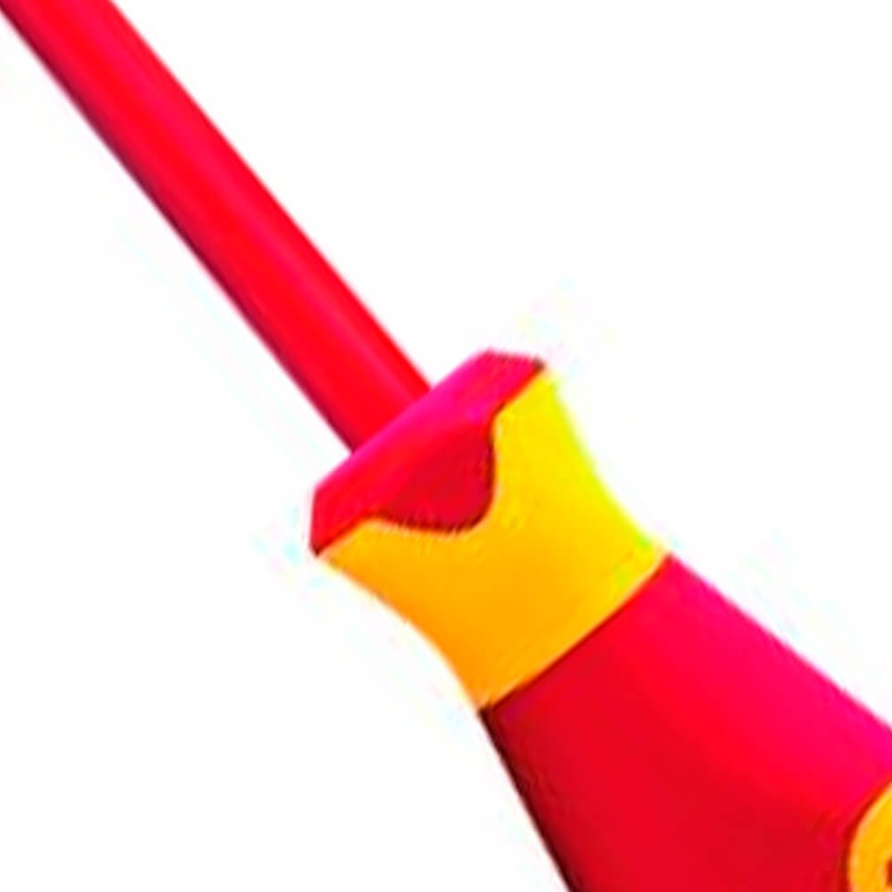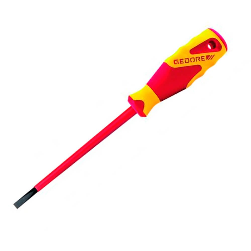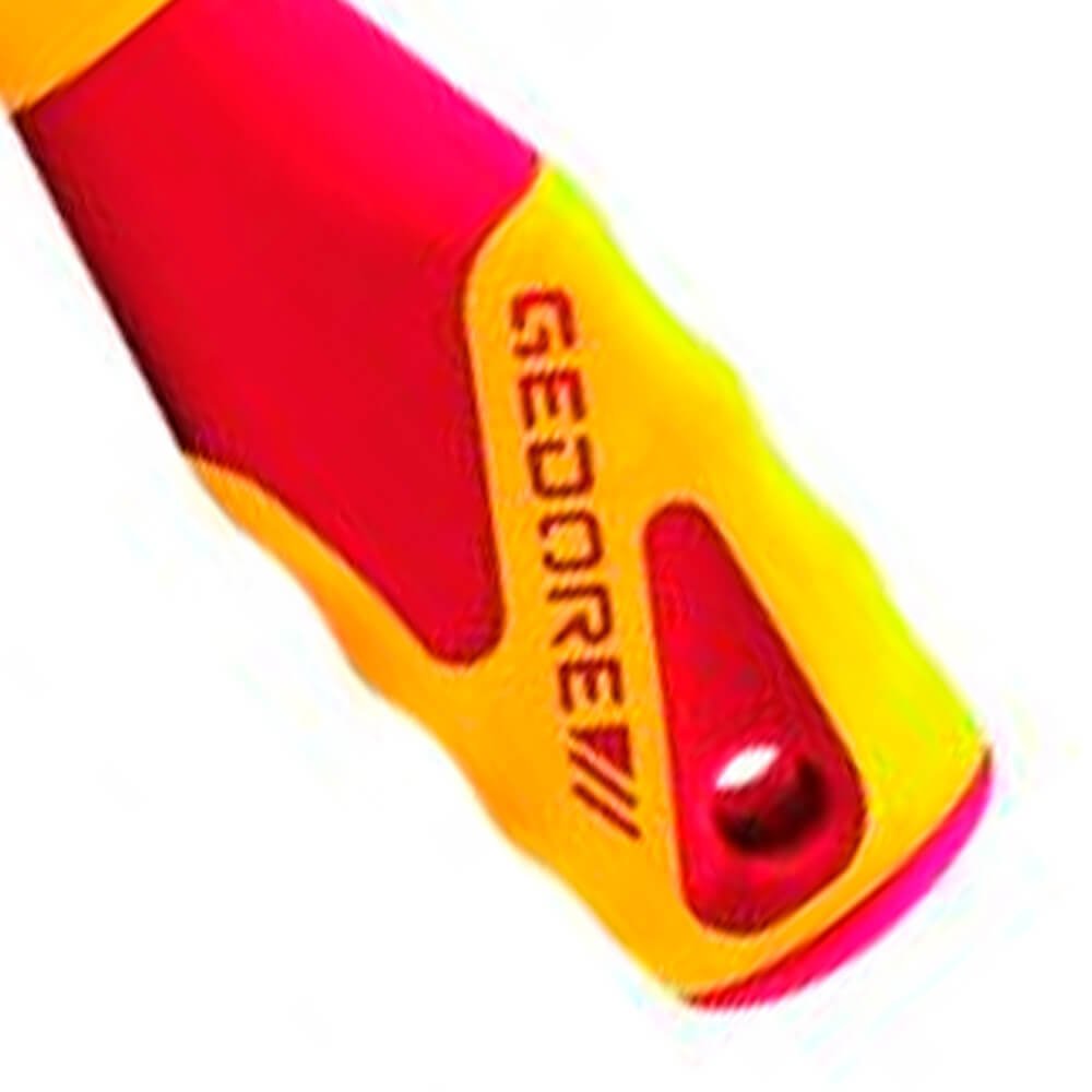 Aço Molibdênio-Vanadium-Plus e polímero anti-chamas, nas cores vermelho e amarelo, padrão Gedore. Haste com acabamento escurecido. Com revestimento produzido por injeção, propiciando isolação até 1000 V, conforme norma EN 60900 / IEC 60900, submetida à ensaios de: impacto, tensão elétrica, aderência, inflamabilidade, pressão/penetração. Utilizar ferramentas isoladas VDE, em tensão máxima de 1000 V em corrente alternada e 1500 V em corrente contínua, conforme norma EN 60900 / IEC 60900. Atende com segurança a norma regulamentadora NR 10 - Segurança em Instalações e Serviços em Eletricidade, possui certificado de isolação.